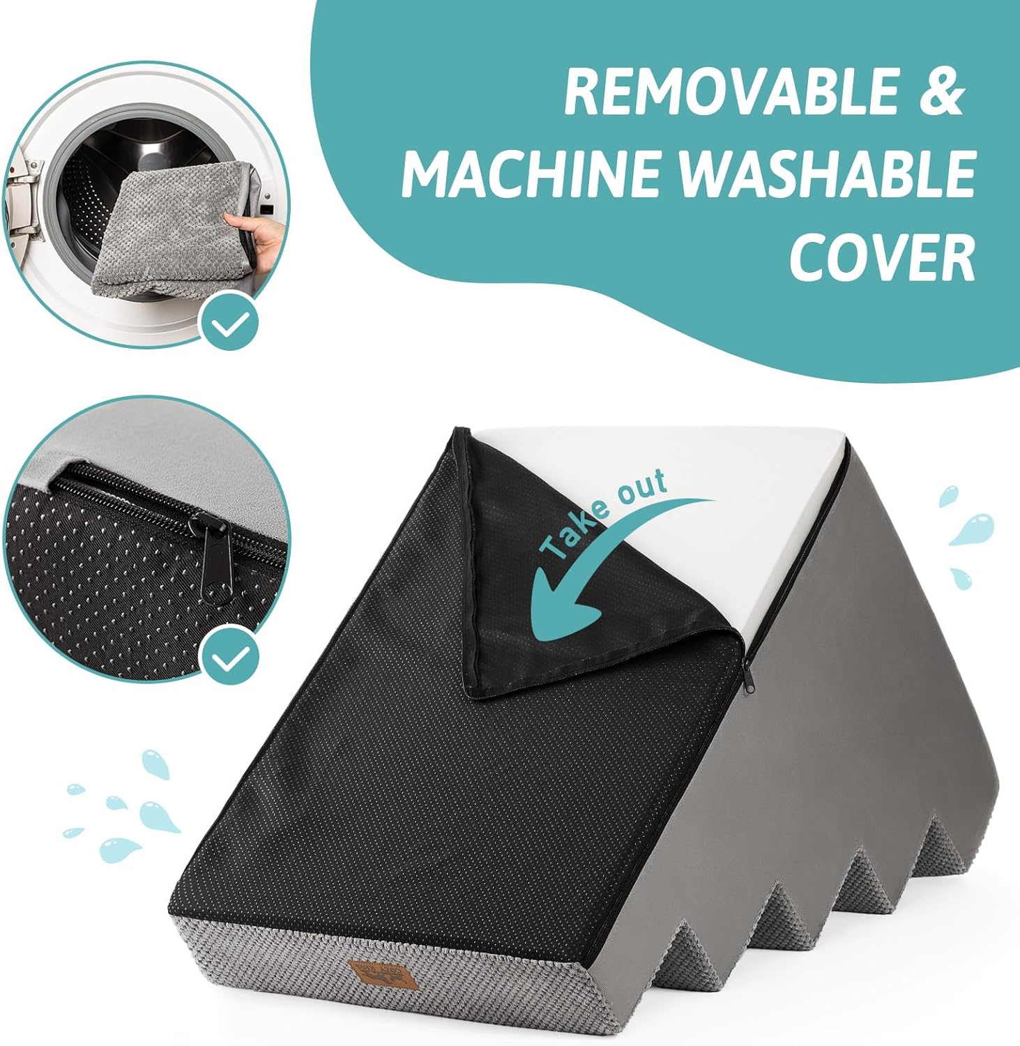• Non-Slip Base and Removable Cover: Our dog steps for beds are equipped with a non-slip base featuring rubber dots for additional grip, minimizing movement during use. The pet steps cover is waterproof on the inner side, so you donโ€™t have to worry about stains seeping into the foam. The outer cover is removable and machine washable for easy cleaning