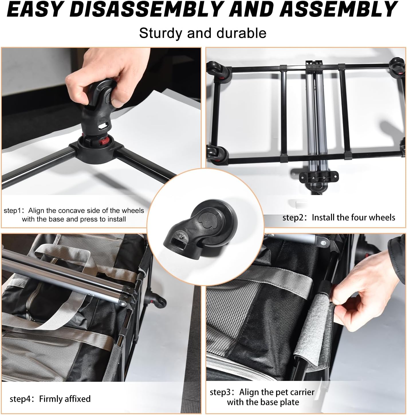• NEWLY UPGRADED PLATFORM AND PULLEYS: The crossbar of the pet carrier with wheels is designed to look like a suitcase, use it as a duffel bag or handbag. With 4 high quality removable wheels that rotate 360ยฐ and a push-button locking handle that can be adjusted to different stages to suit pet owners of all sizes, you can effortlessly move in any direction through the streets, shopping malls, supermarkets, vet hospitals and more.