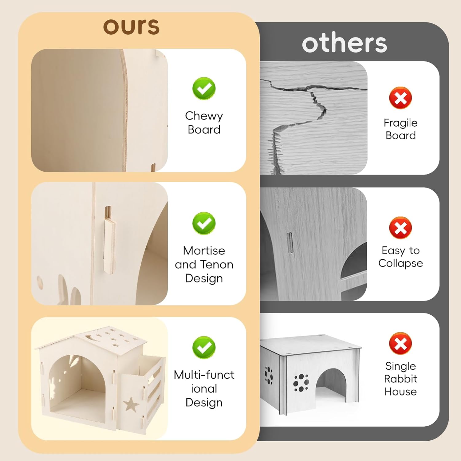 • 【Premium Materials】The bunny houses is made of poplar plywood. It is a safe and harmless material that processed from natural wood. Providing a healthy and cozy environment for your bunny to explore and rest.