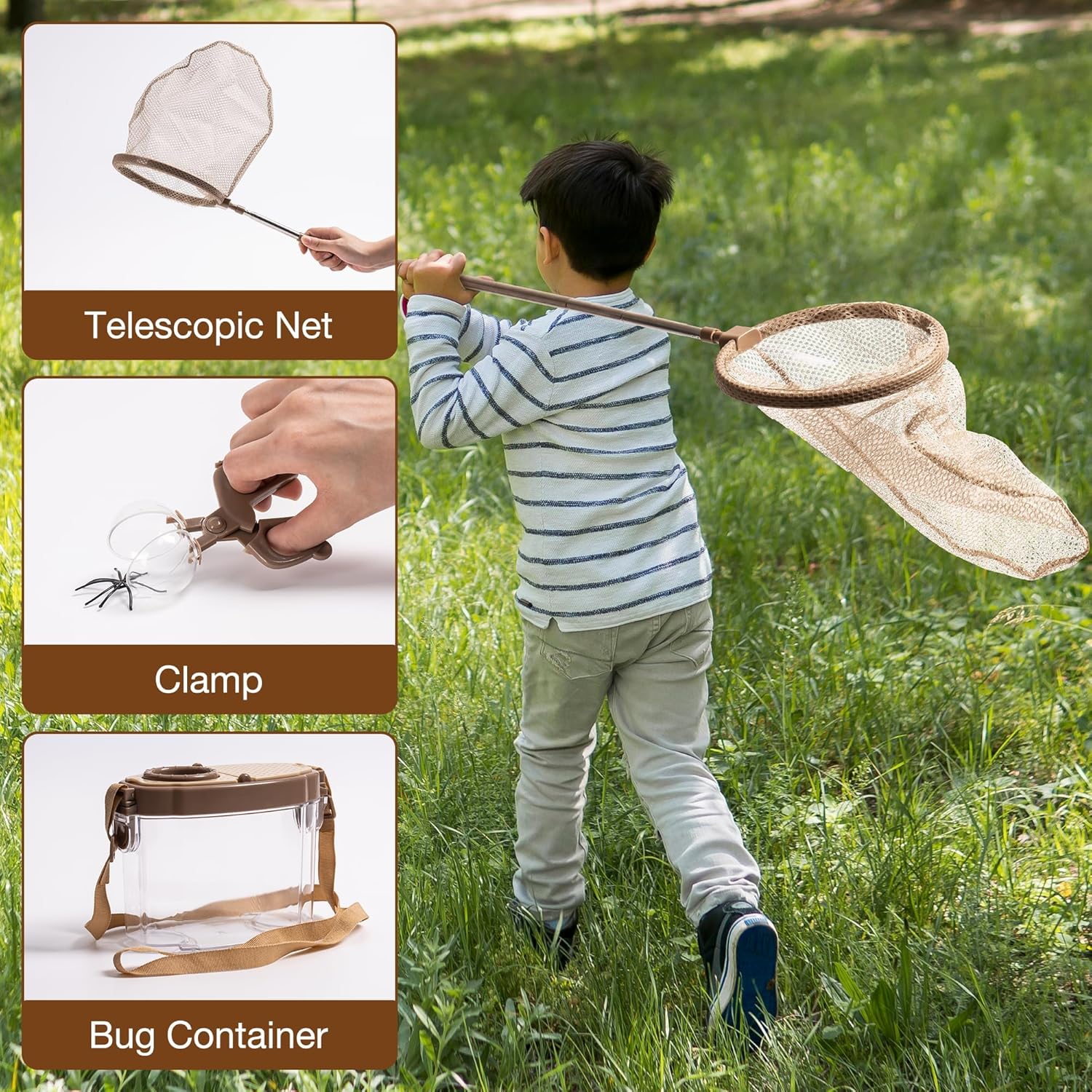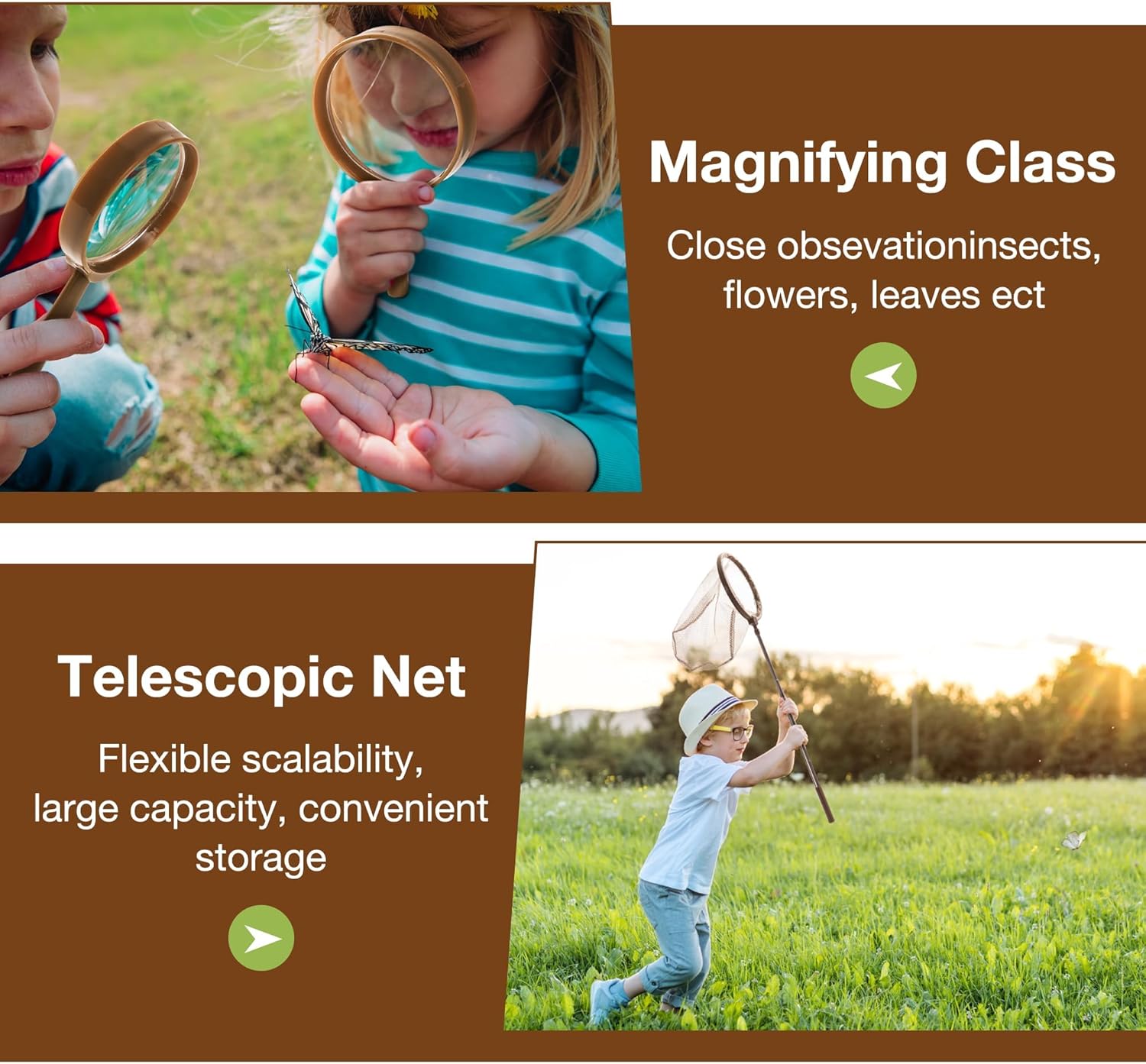 • 【All-in-One Adventure Kit】 This comprehensive set includes a magnifying glass for close-up observations, an extendable net, tweezers, a grabber, a cage, a container, cards, and a portable bag. It has everything kids need to dive into exciting outdoor adventures.