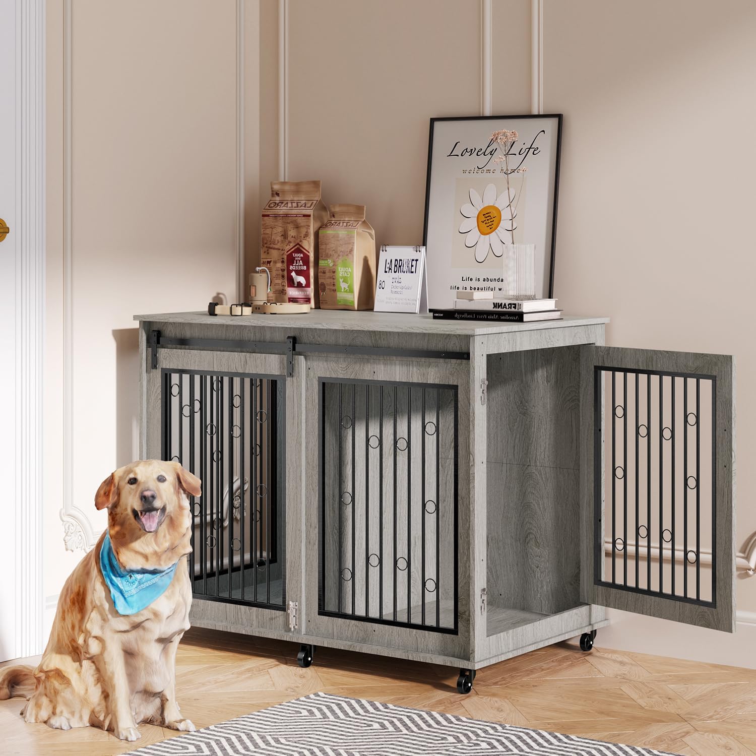 • 【Convenient Double-Door Access】Featuring a sliding barn-style door on the front and a side door, this indoor dog kennel allows for easy entry and exit. Ideal for active dogs that enjoy moving around freely.
