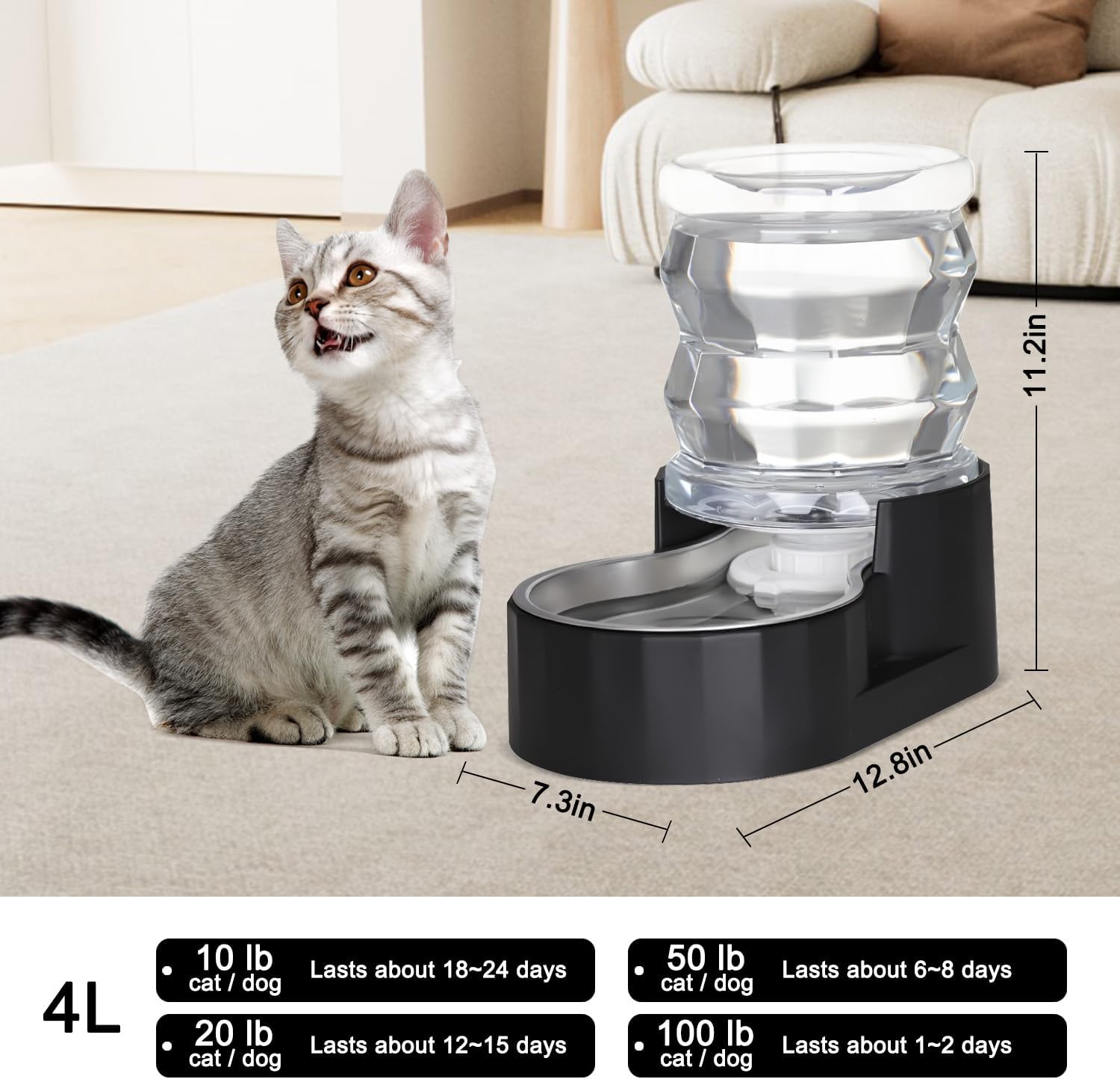 • Large Capacity:Tailored for kittens, this water dispenser utilizes gravity to slowly fill the bottle with water, effectively extending the filling cycle and ensuring that the 4-liter capacity is sufficient to meet the kitten's daily drinking needs. Whether the pet owner is traveling or busy at work, you can rest assured that your pet's drinking problem can be solved.