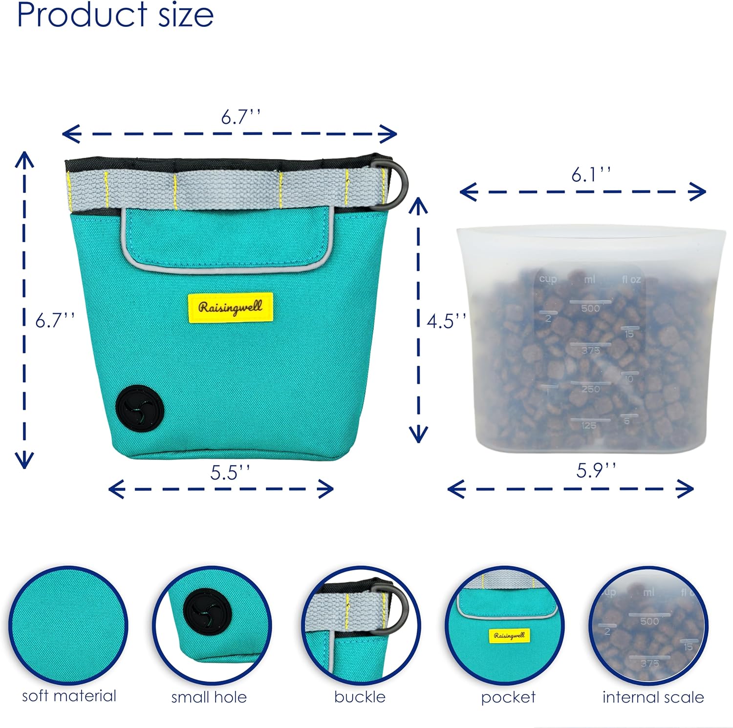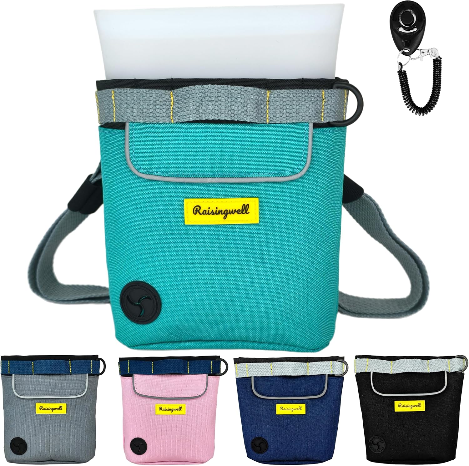 • 5.Durable Tech Material: Raisingwell's dog treat training pouch is made from durable, washable, and non-toxic fabric. Notably, its waterproof lining solves the problem of difficult-to-clean interiors of training bags, making it a great choice for your dog treat bag or dog treat fanny pack.