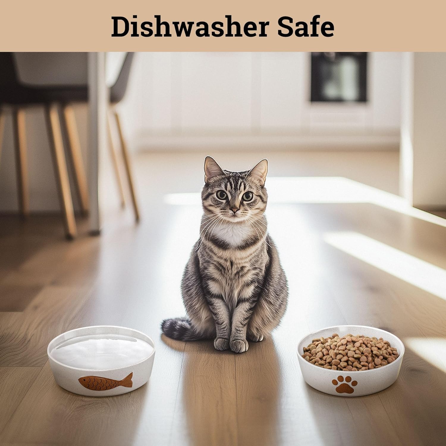 • DISHWASHER SAFE CAT BOWLS - This ceramic cat bowl set is food safe, dishwasher safe, and microwave safe. With thick walls, these ceramic cat bowls are sturdy, leak-free and weighty yet not too heavy.