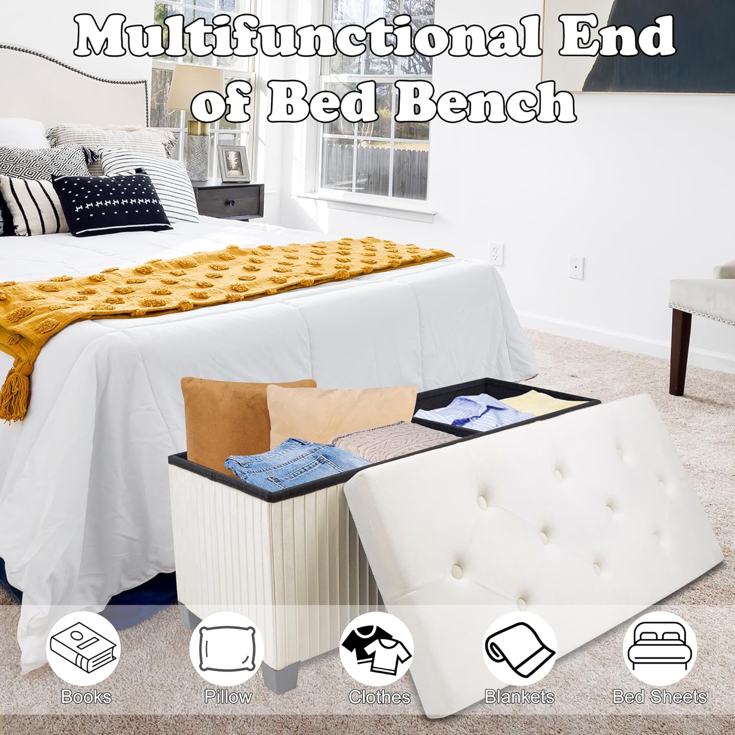 • Comfortable Ottoman: Our bed stools are made of high-quality velvet fabric, providing a luxurious texture that is both skin friendly and comfortable. The upholstered ottomanโ€™s surface is filled with high-density sponge, which is soft, skin friendly, and not easily deformed.