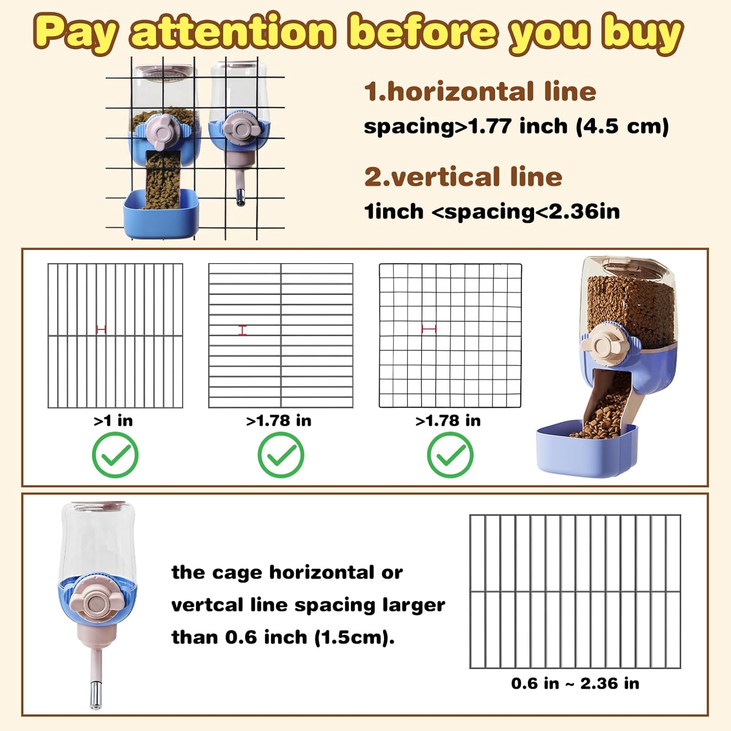 - Tips: the recommended cage net spacing is 2.5-6cm(1-2.36 inch), please measure the cage net spacing carefully before purchase and make sure it can be used, if the spacing is less than 1 inch, you can try to bend the kennel wire bars a little bit