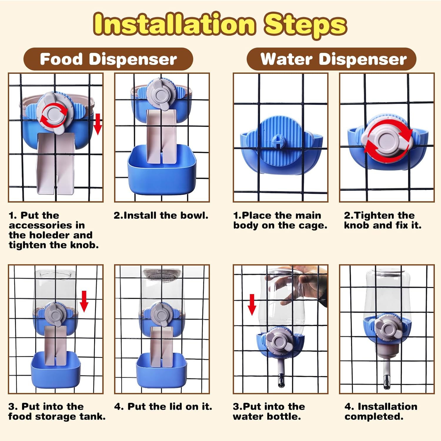 - Easy to Install: Just rotate the buttons and it can be easily installed inside and outside of the cage, no other tools needed, the connection is corrugated for more solidity