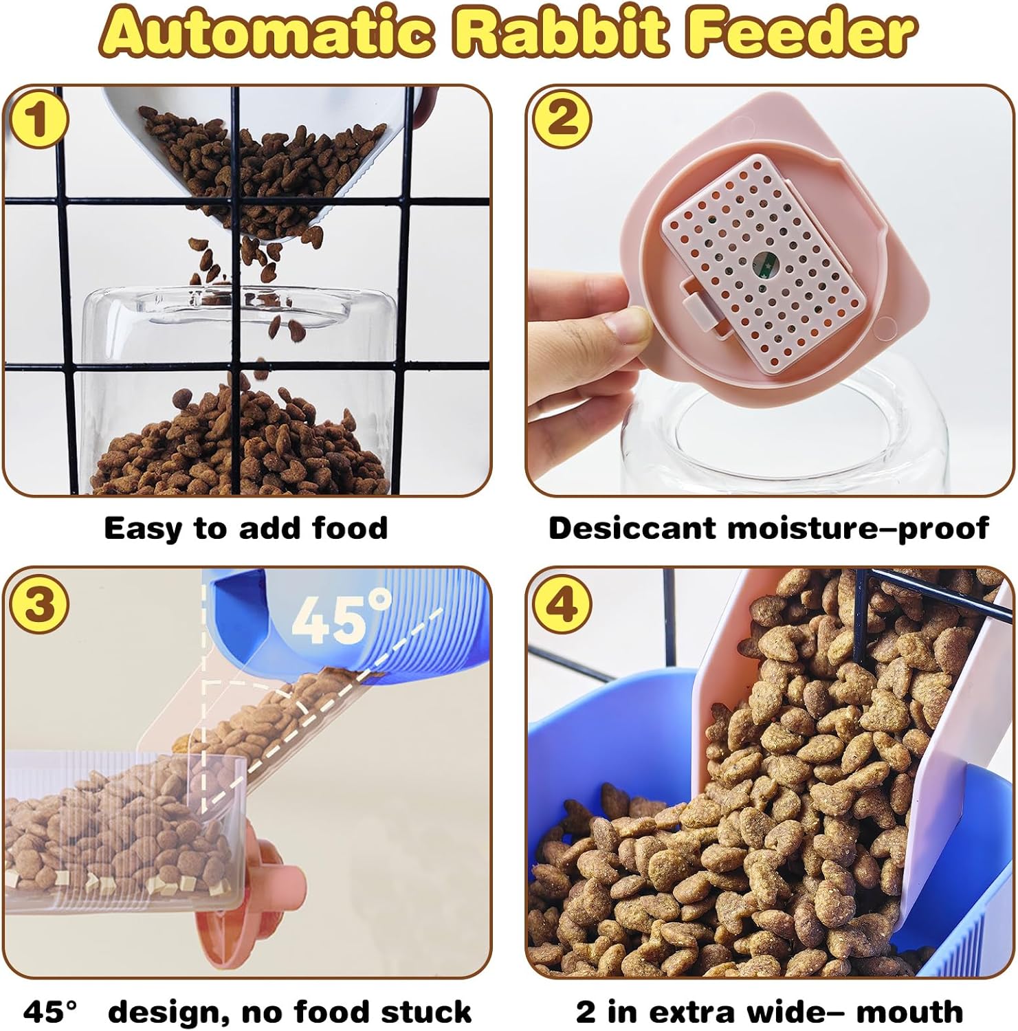 - Automatic Gravity Feed Design: Rabbit food dispenser features gravity feed technology with a 2-inch spout and 45-degree incline for smooth food refills and refuses food clogging problems