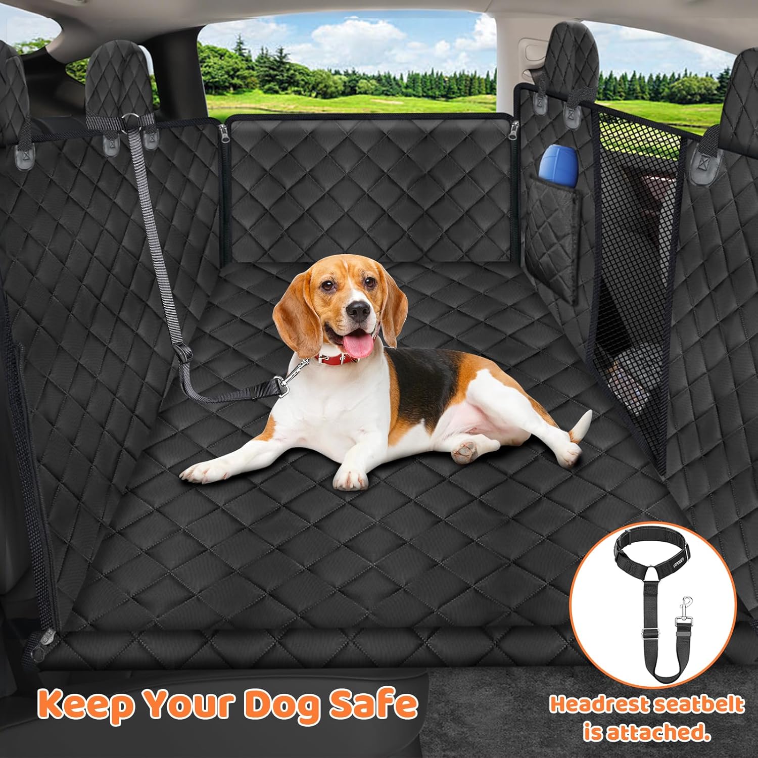 - Easy to Use: Made of waterproof 600D Oxford material, the dog seat cover is easy to clean with a damp cloth or vacuum. It can be quickly installed and a headrest dog seat belt is included to secure your dog