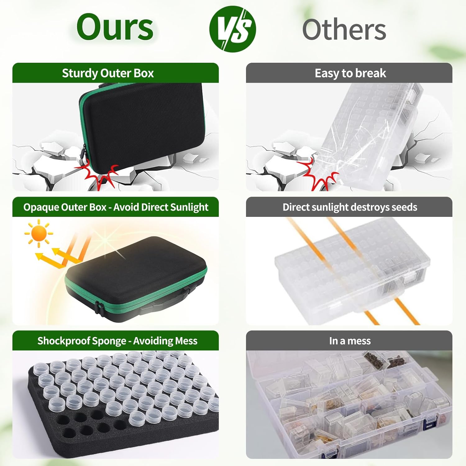 - Seed Storage Organizer: The high-quality outer box avoids light and keeps seeds safe for longer. Built-in tight sponge slots hold the bottles firmly in place, no mess while traveling. The bottle's twist-off lid ensures that it won't pop open and the seeds won't fall out. Not only large capacity but also reusable to organize a large number of different varieties of plant seeds. Solve your seed storage and categorization needs at once, say goodbye to chaos!