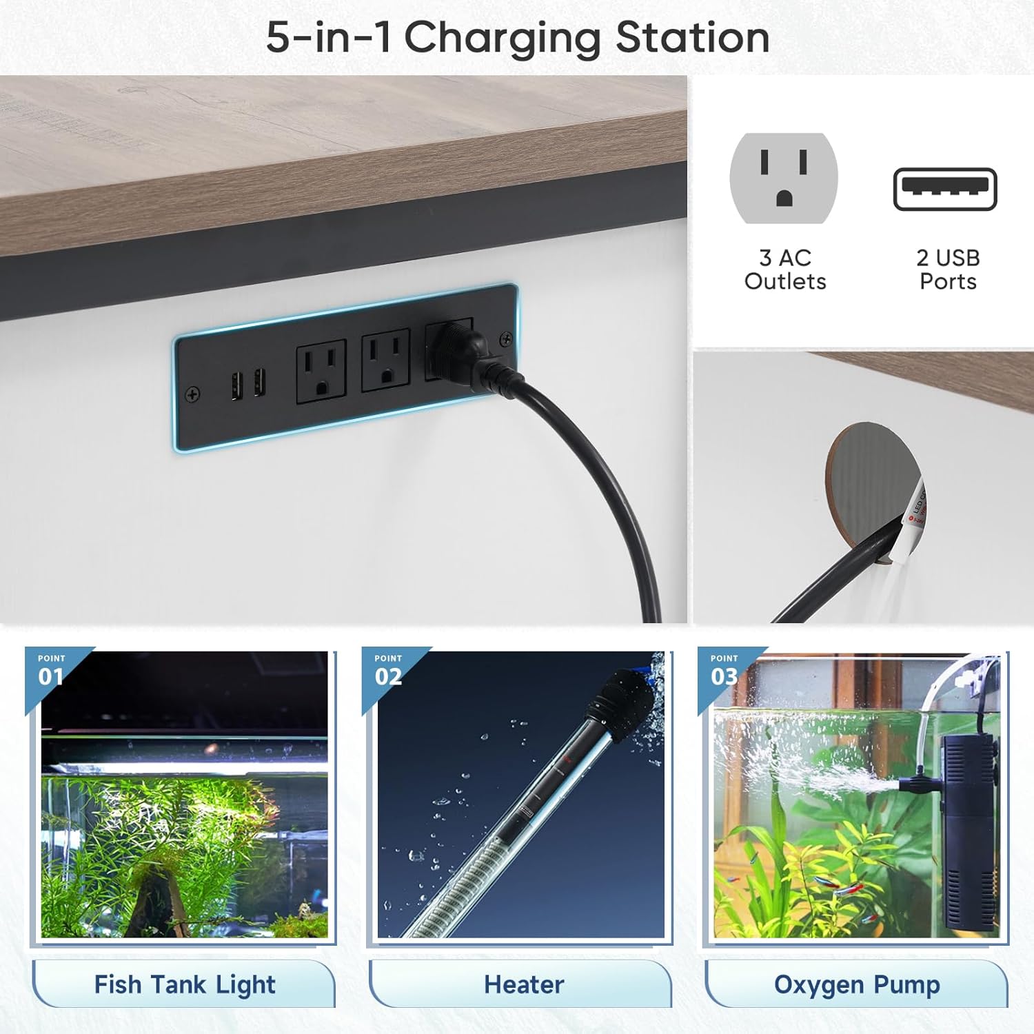 - 【Convenient Power Management】-This fish tank stand boasts a built-in power strip with 3 outlets and 2 USB ports, which make it easy to connect electronic devices: lights, heaters, and oxygen pumps, etc. Plus a cable hole for discreet cord routing, simplifying your fish tank management.