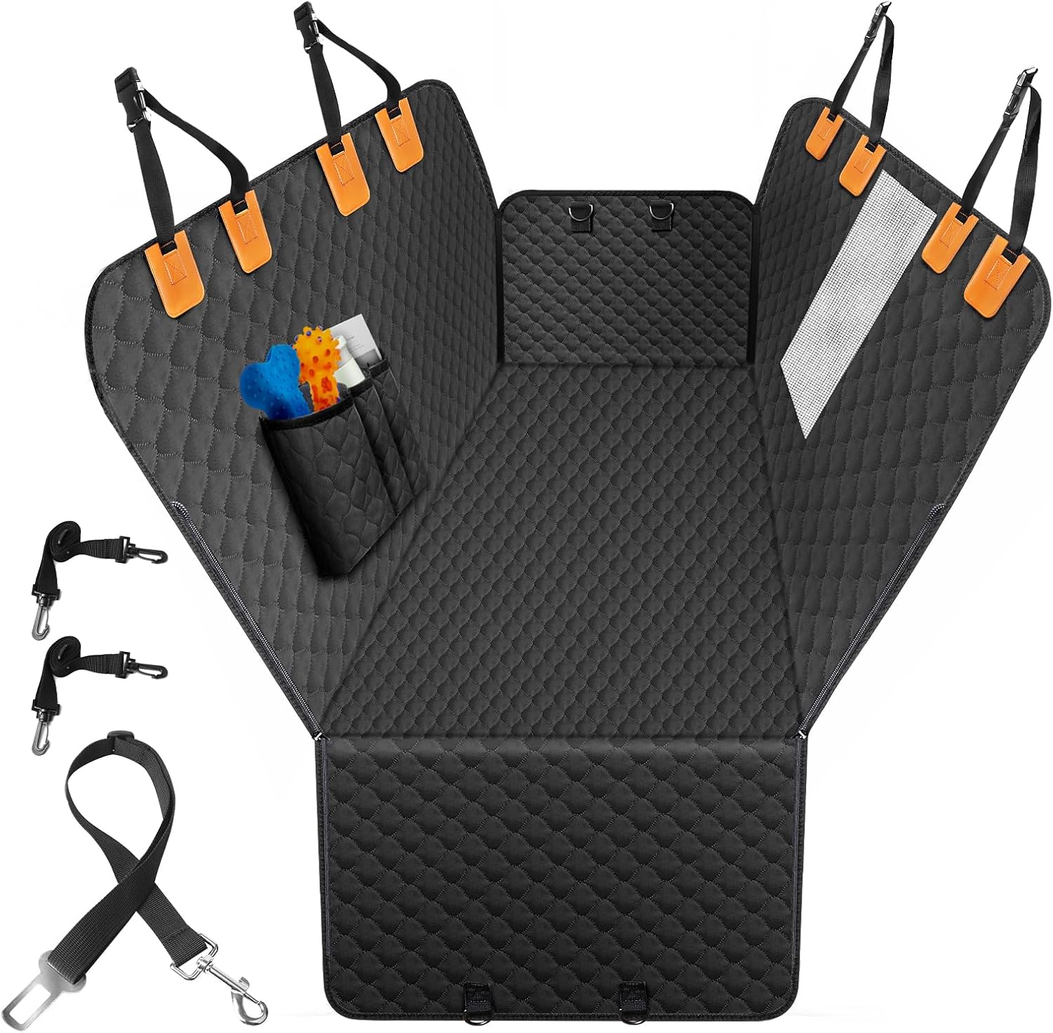 • Water-Resistant & Durable: Made with high-quality 600D polyester in the center and lightweight 420D polyester on the sides, this car dog cover provides a water-resistant layer, preventing stains, dirt, and moisture from damaging your car’s upholstery. It also works well as a protection layer for baby car seats.