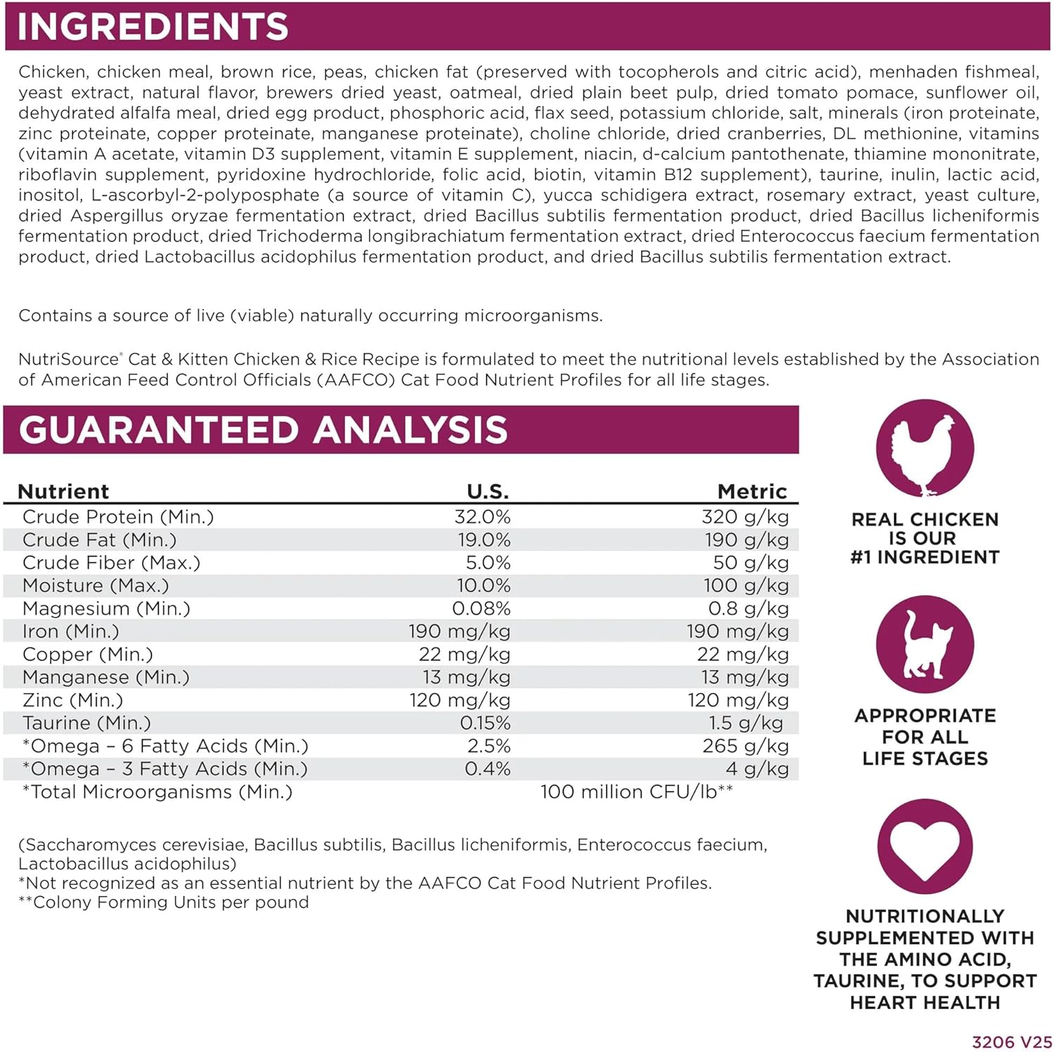 • As a member of our grain inclusive series of cat foods, NutriSource Cat & Kitten Chicken & Rice Recipe is formulated to meet AAFCO guidelines for all life stages