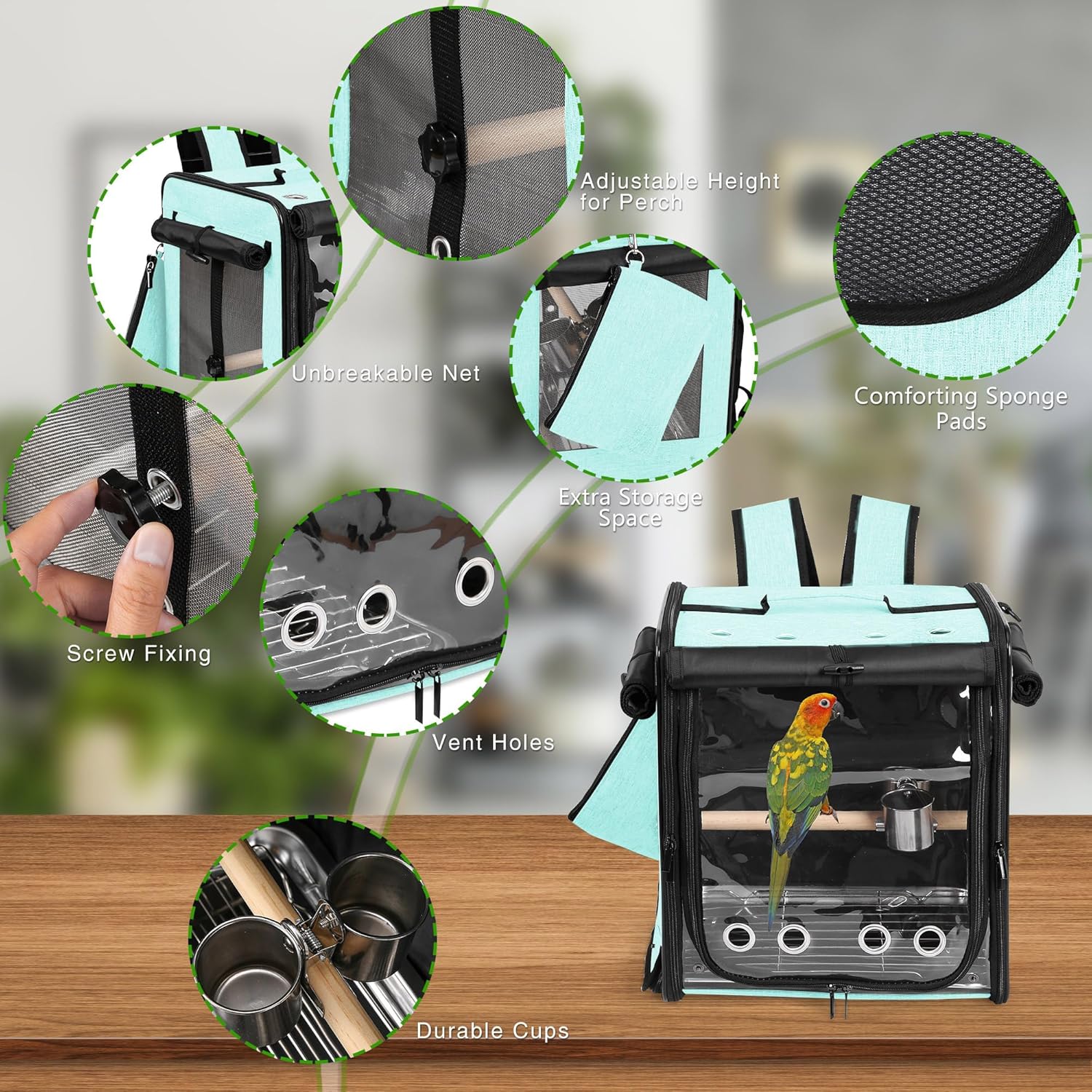 • 【STAINLESS STEEL MESH】 Roll up the sunshade of the bird travel cage and fix it. You can check the status of your bird at any time through the transparent window. The side of the bag is equipped with anti scratch 304 stainless steel mesh to ensure sufficient air circulation and no bird can chew it out.