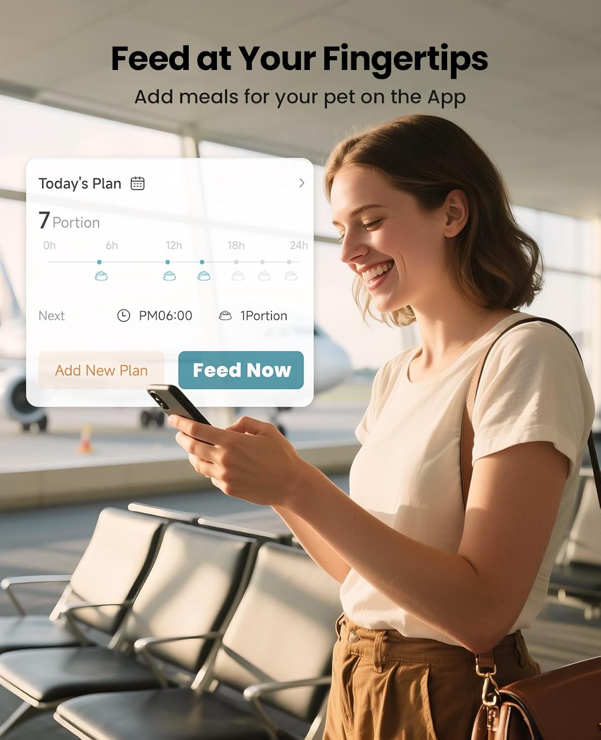 • Smart App Control: Program up to 10 daily meals (1-12 portions each) remotely via 2.4GHz WiFi from anywhere at any time. Monitor your pet's feeding patterns through the iOS/Android app to prevent overeating and maintain healthy eating habits
