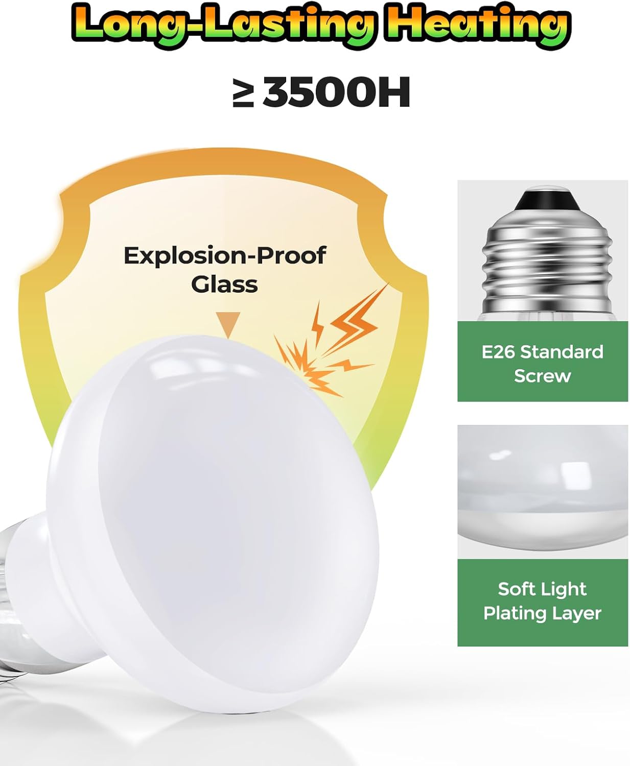 • Premium Reptile Heat Lamp: Our basking light is crafted from high-quality glass and filament materials, ensuring safe and reliable use. Designed for durability, this heat lamp delivers consistent performance with a lifespan of up to 3,500 hours. Plus, each reptile light bulb undergoes rigorous inspections and safety certifications, guaranteeing top-notch quality and safety