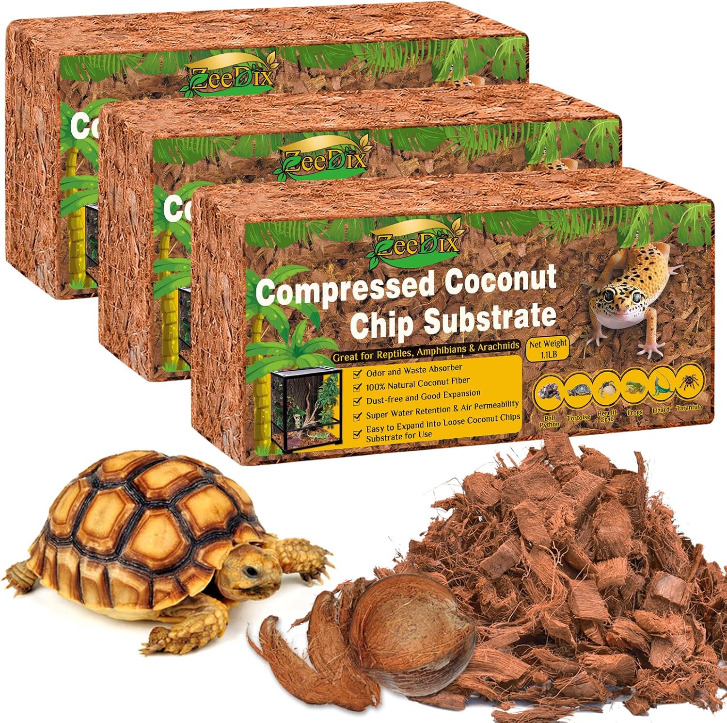 ZeeDix 3PCS Natural Coconut Chips Substrate for Reptiles, Coconut Fiber Husk Reptiles Bedding, Compressed Coco Chips Substrate for Ball Python, Snakes, Tortoise, Hermit Crab, Frogs, Lizard, Tarantula
