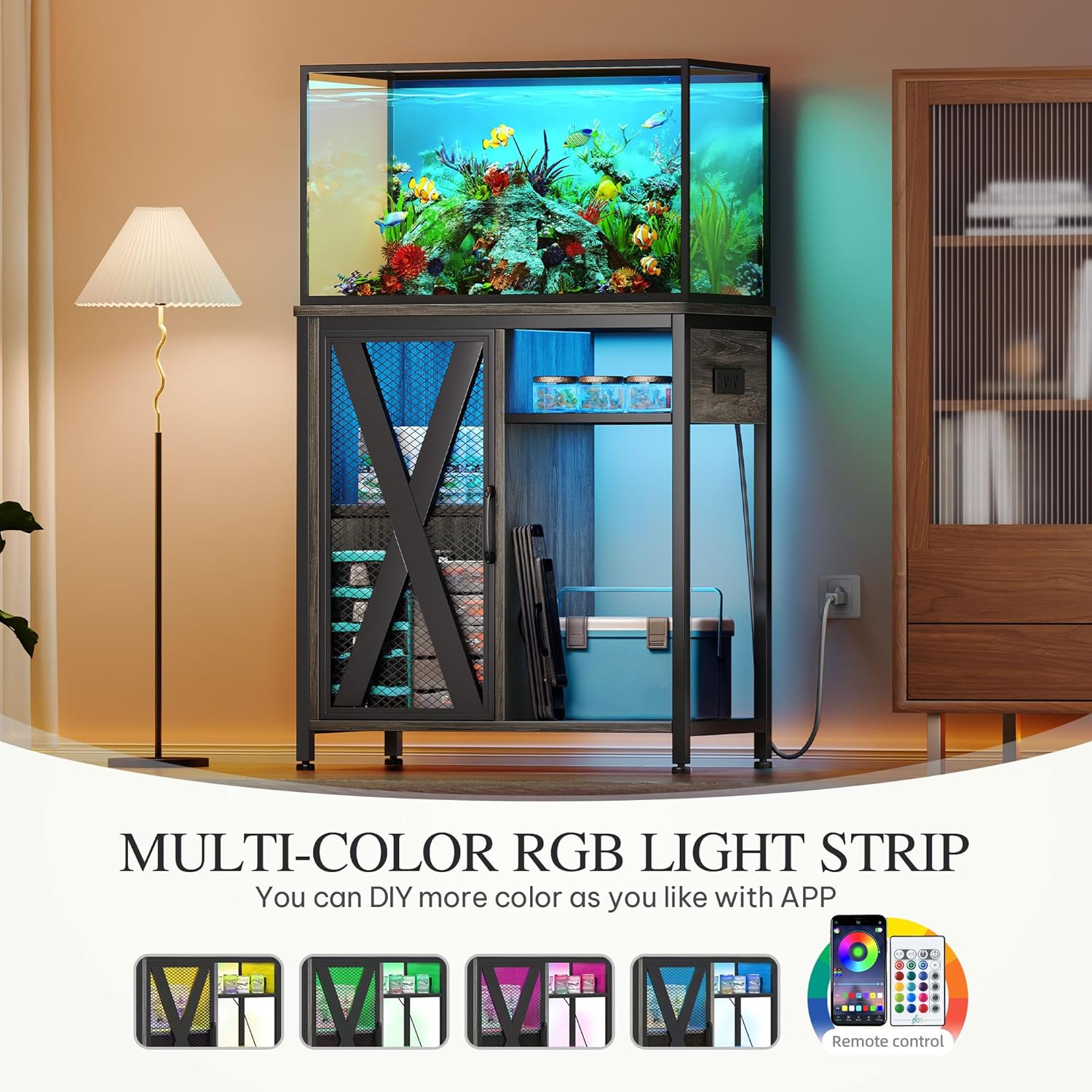 • Smart LED Lights: Enhance Your Aquatic Oasis with Our Captivating Aquarium Stand. Featuring Mesmerizing LED Lighting with RGB Customization, immerse yourself in a tranquil ambiance that can be tailored to suit any mood or occasion. Keep water away from outlets & led lights when turned on to prevent damage