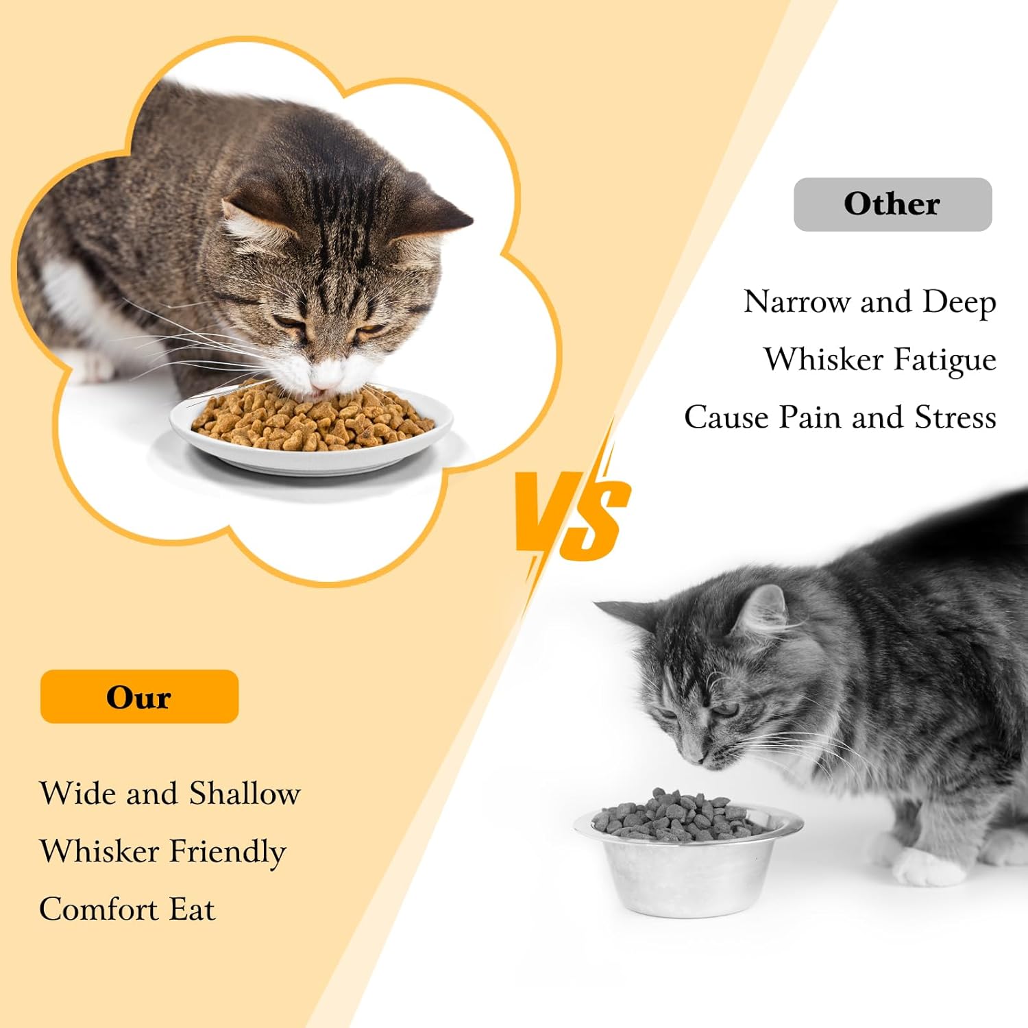 • Cat Bowls Whisker Friendly:The flat cat food dishes with a wide and shallow round design(6 inches wide, 0.8 inches deep, 100ml capacity).Not only keeps the face clean and tidy, but also relieves the cat's whisker fatigue, creating a comfortable eating environment for the cat