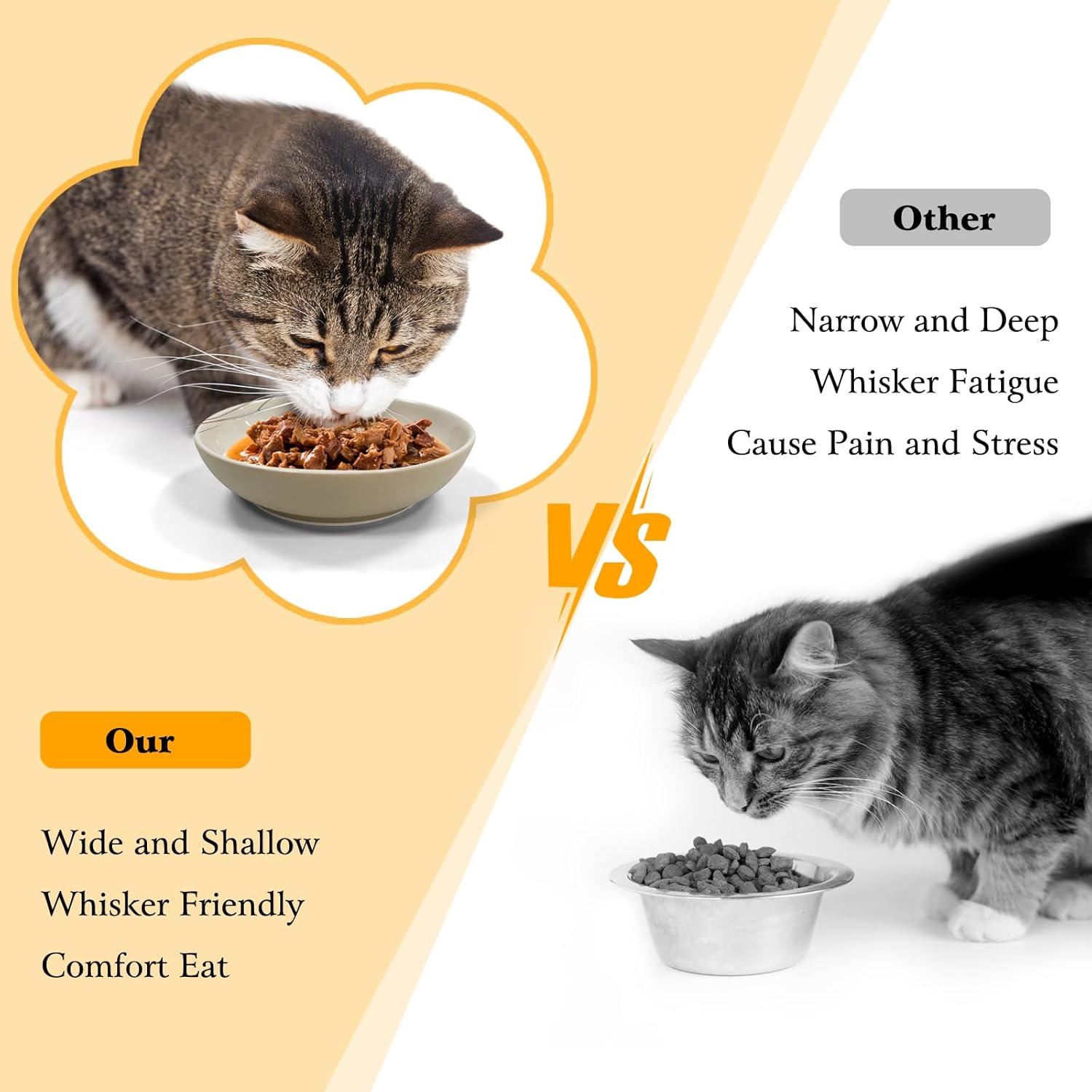 • Cat Bowls Whisker Friendly:The flat cat food dishes with a wide and shallow round design(5.6 inches wide, 1.4 inches deep, 200ml capacity).Not only keeps the face clean and tidy, but also relieves the cat's whisker fatigue, creating a comfortable eating environment for the cat