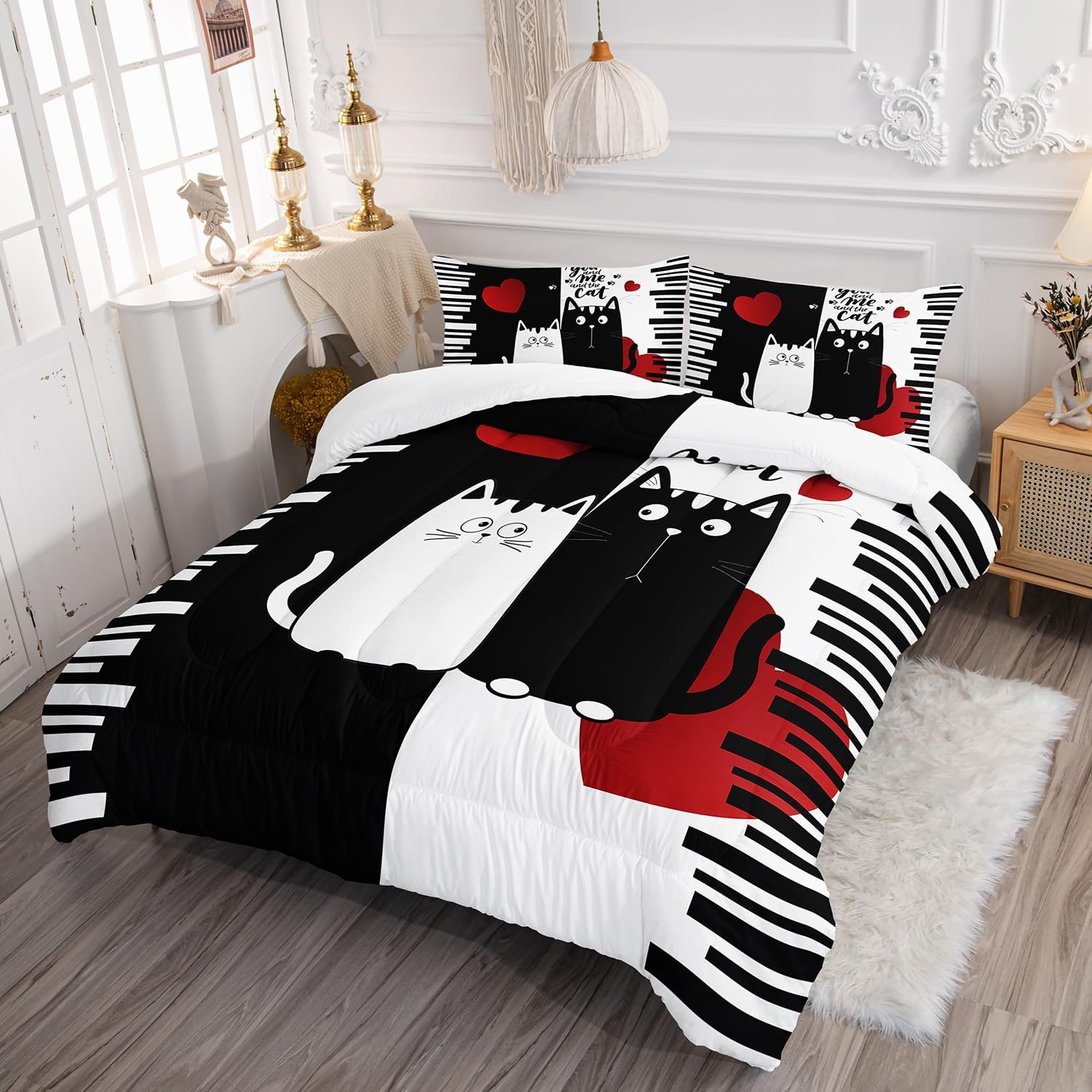 • Cute cat design: This cat comforter adopts the latest 3D printing technology and a unique design style. Two cartoon cats, one black and one white, one big and one small, were used, paired with a red heart-shaped pattern and unique lines. Very suitable for children, women, and companions who love pets. It can make your room lively and interesting. Make your bedding look lively and cute.