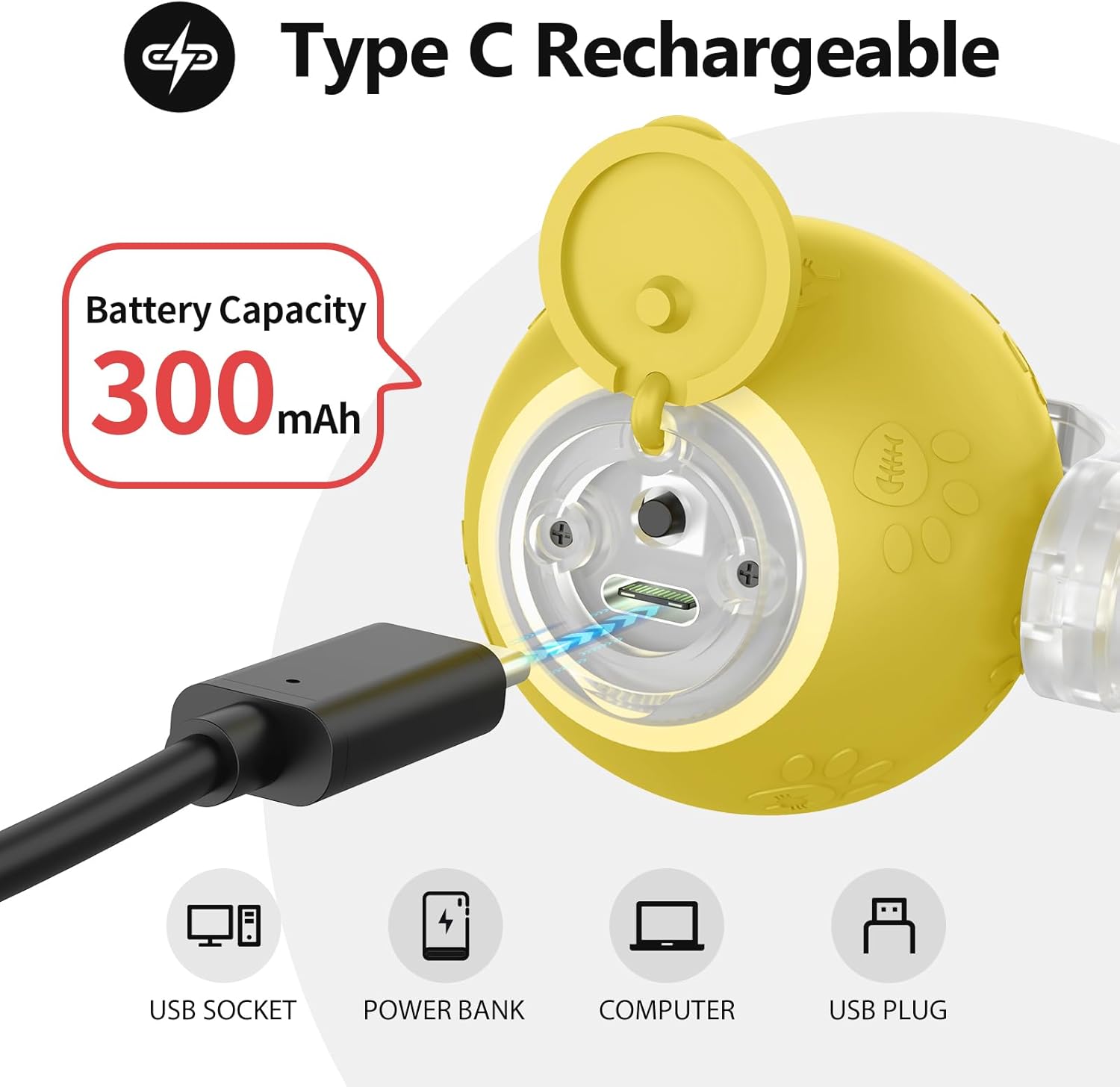 • USB Rechargeable: This interactive cat toy has a built-in rechargeable battery, and the charging port is located inside the switch button cover. Open the cover and easily charge it using the included USB cable.