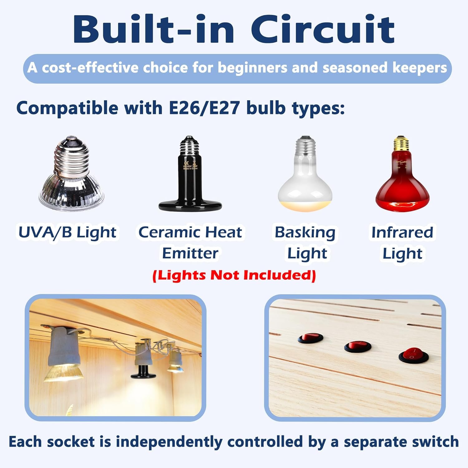 - 【Integrated Bulb Sockets】Take the hassle out of lighting with built-in bulb sockets and switches. Feature two (the larger 40-inch and 48-inch models feature 3) sockets compatible with E26/E27 bulbs (bulbs not included), supporting heating, daylight, and night lighting needs. Simple to install, these pre-installed sockets saves money on lamps and make it effortless to create the ideal environment for your reptiles.