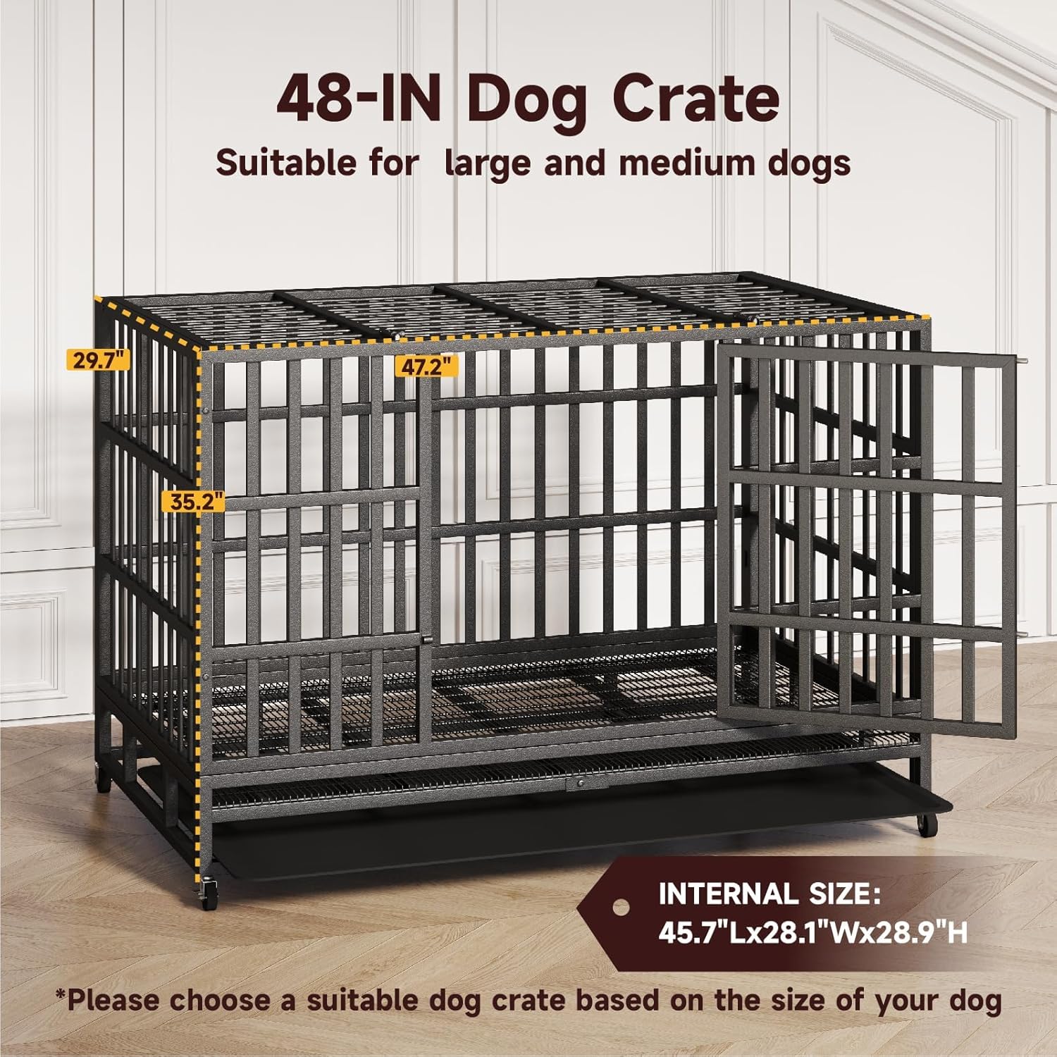 • Durable Dog Crate:The 48" upgraded dog cage is indestructible.It is made of corrosion-resistant and reinforced 0.79 inch diameter steel tubes.Multi-layered protective non-toxic coating keeps your dog healthy,suitable for most medium and large dogs