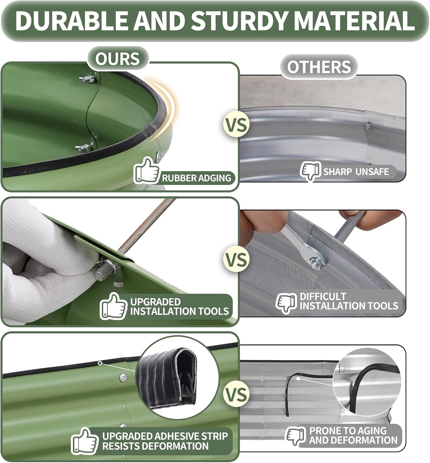 - 【Safety Edge Design & Durable Rubber Strips】The garden bed's top and bottom edges are folded to eliminate sharp edges, ensuring safety from all sides. Rubber strips add extra protection and cushioning, with built-in patches for durability. The galvanized planting box offers the perfect solution for creating your ideal vegetable garden. With the 1More raised bed, enjoy a worry-free gardening experience, prioritizing your safety and convenience. The ultimate choice for a hassle-free and enjoyable gardening experience