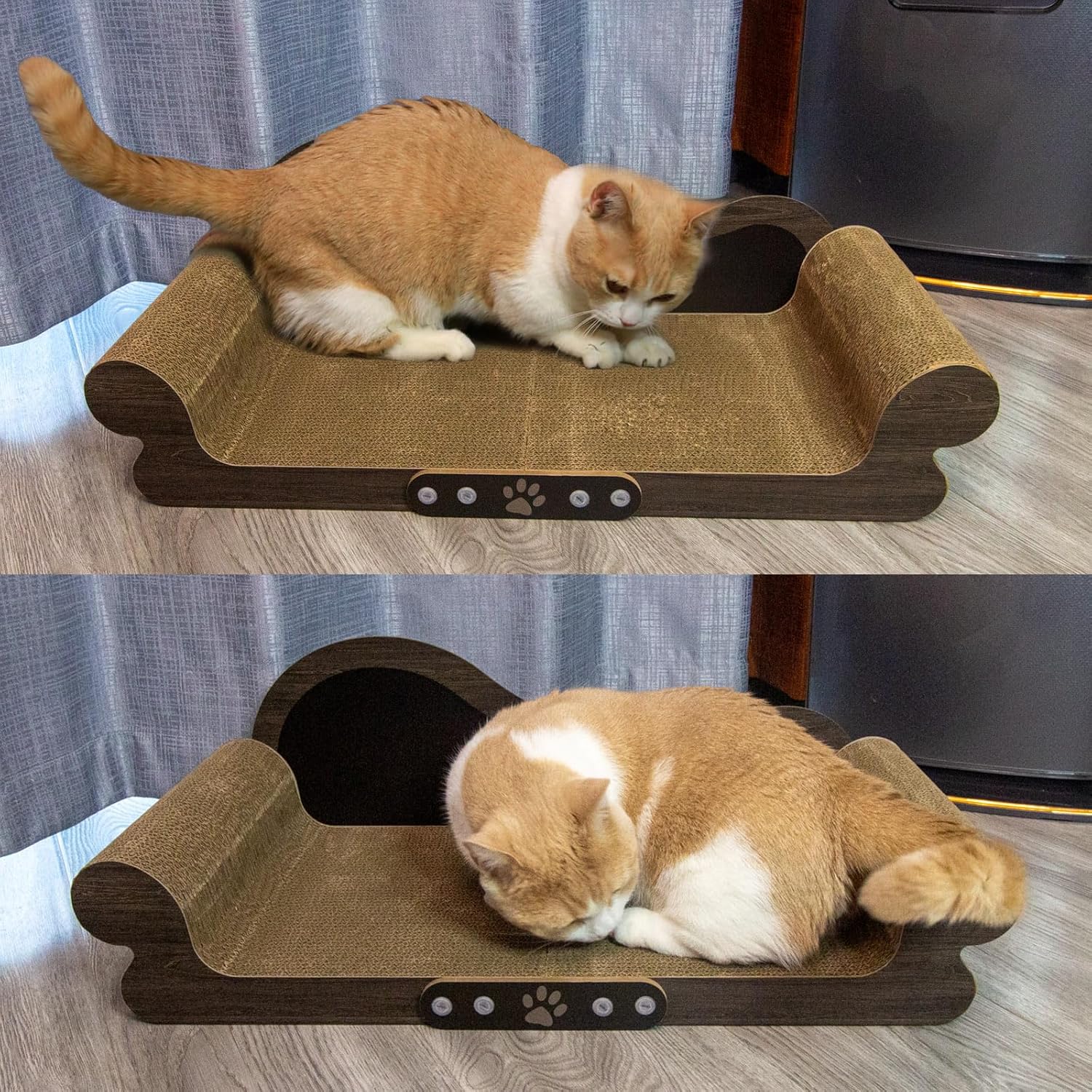 • THICK AND SOLID: the cat scratcher couch made of high-quality cardboards with solid structure is safe and comfortable for cats to rest or scratch, we use thicker cardboards to ensure that cats can sit more stably on his/her exclusive couch, and it is close enough to the ground that you won't have to worry about rolling off.