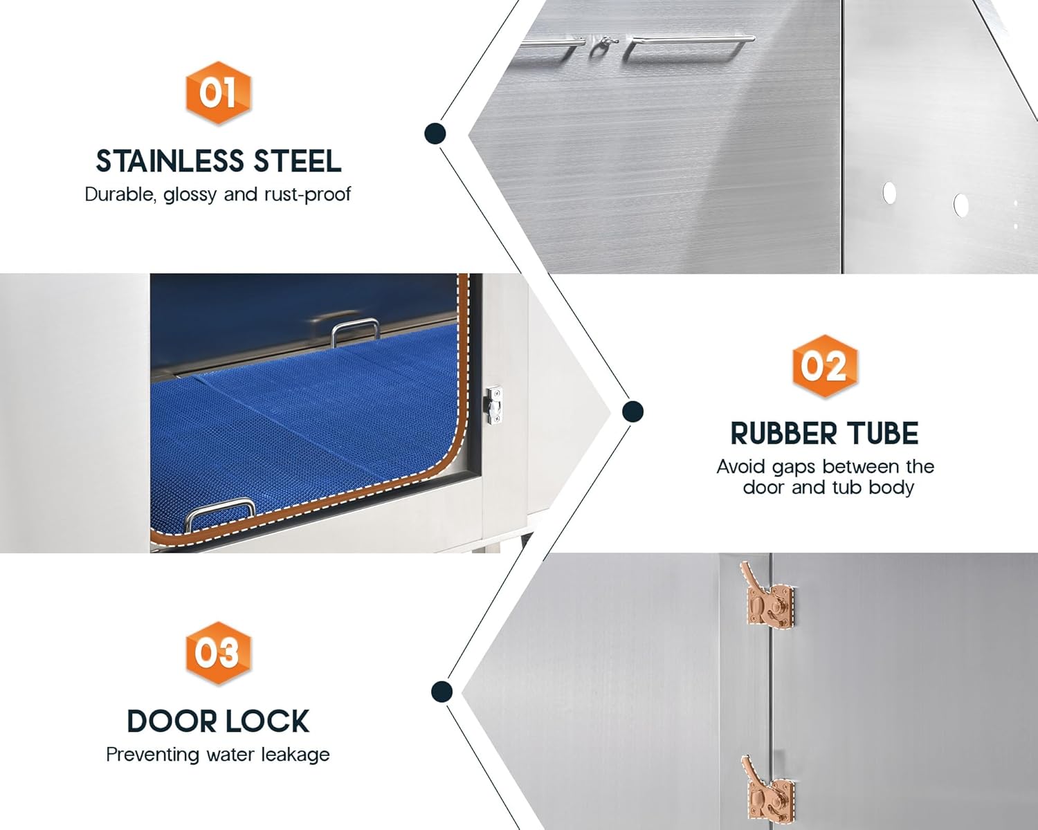 • Leak-proof Design: 50-inch dog wash station, suitable for various pet sizes. Innovative seamless welding, rubber tube and door locks ensure no leaks or pets running out during use.