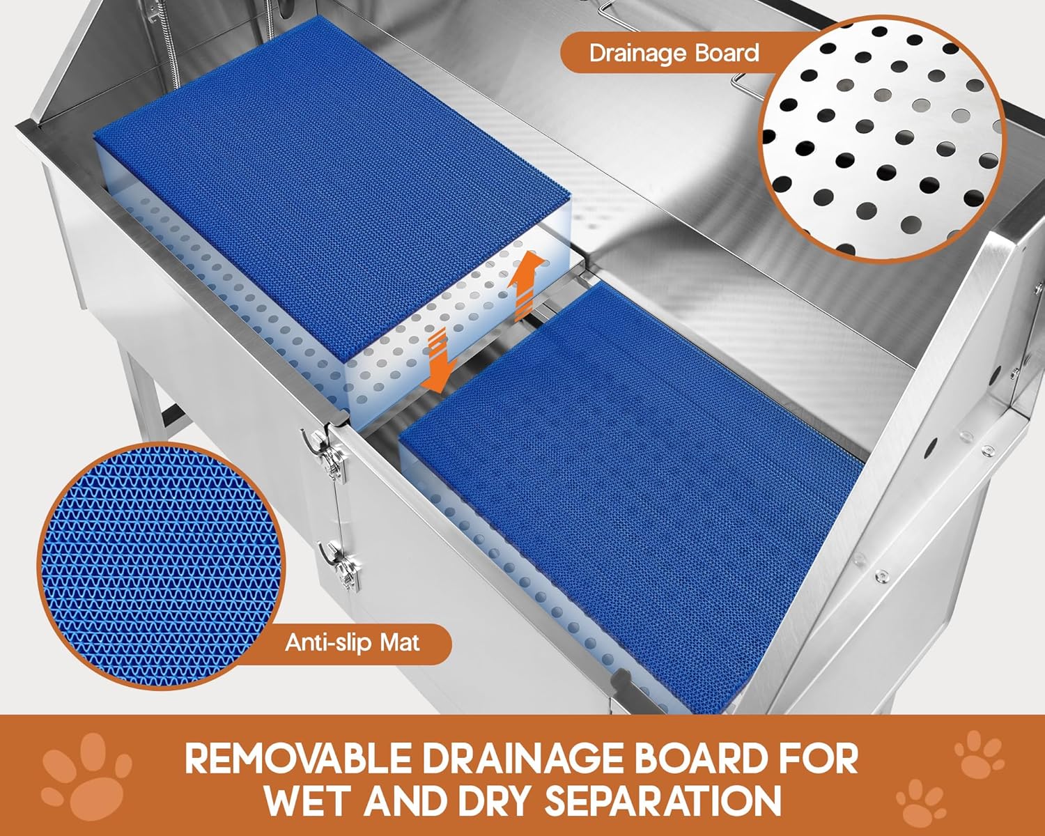 • Removable Drainage Board: Height-adjustable, removable drainboard of pet bathtub accommodates pets of various sizes and supports up to 440 lbs. Also equipped with anti-slip pads.