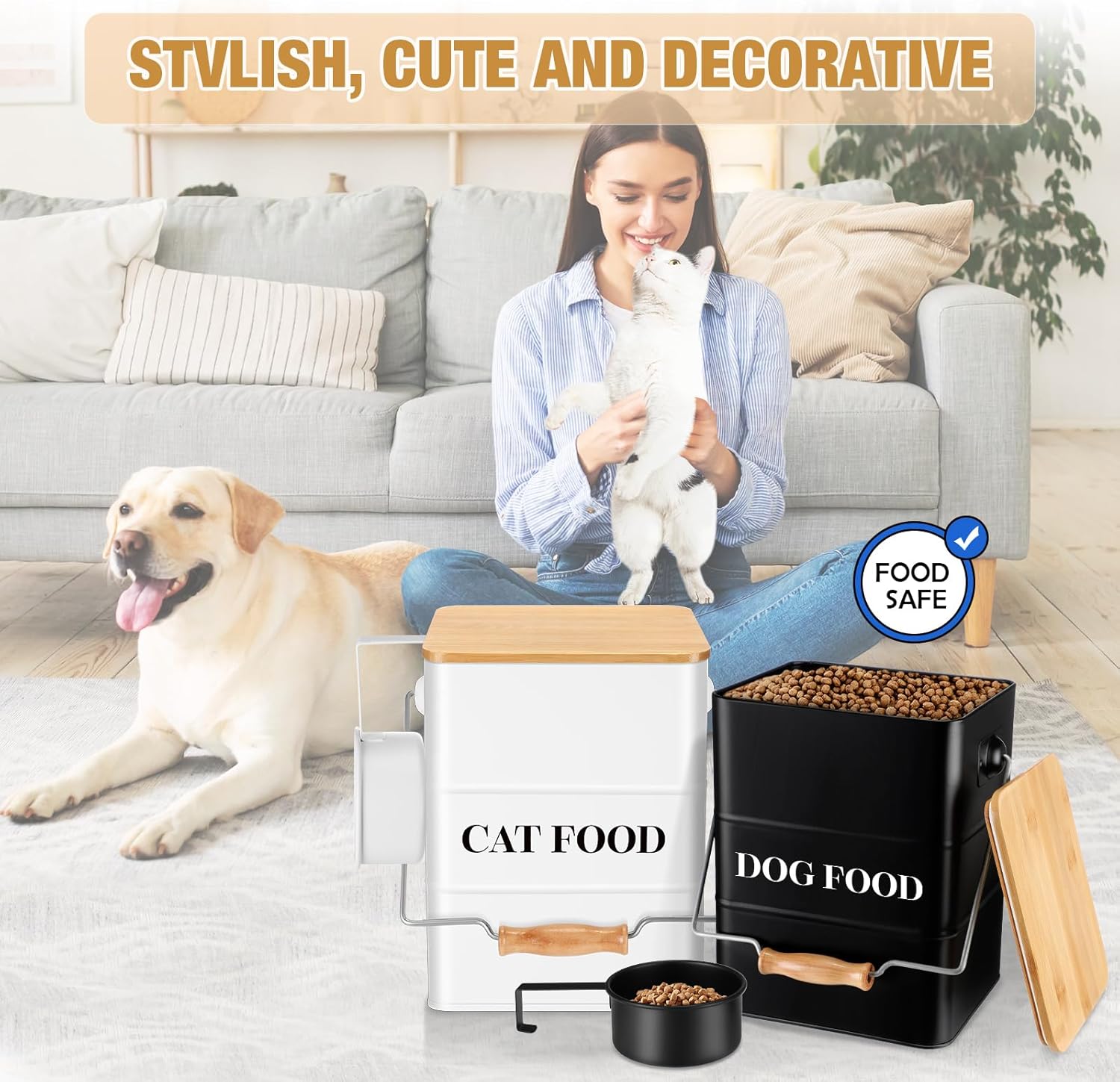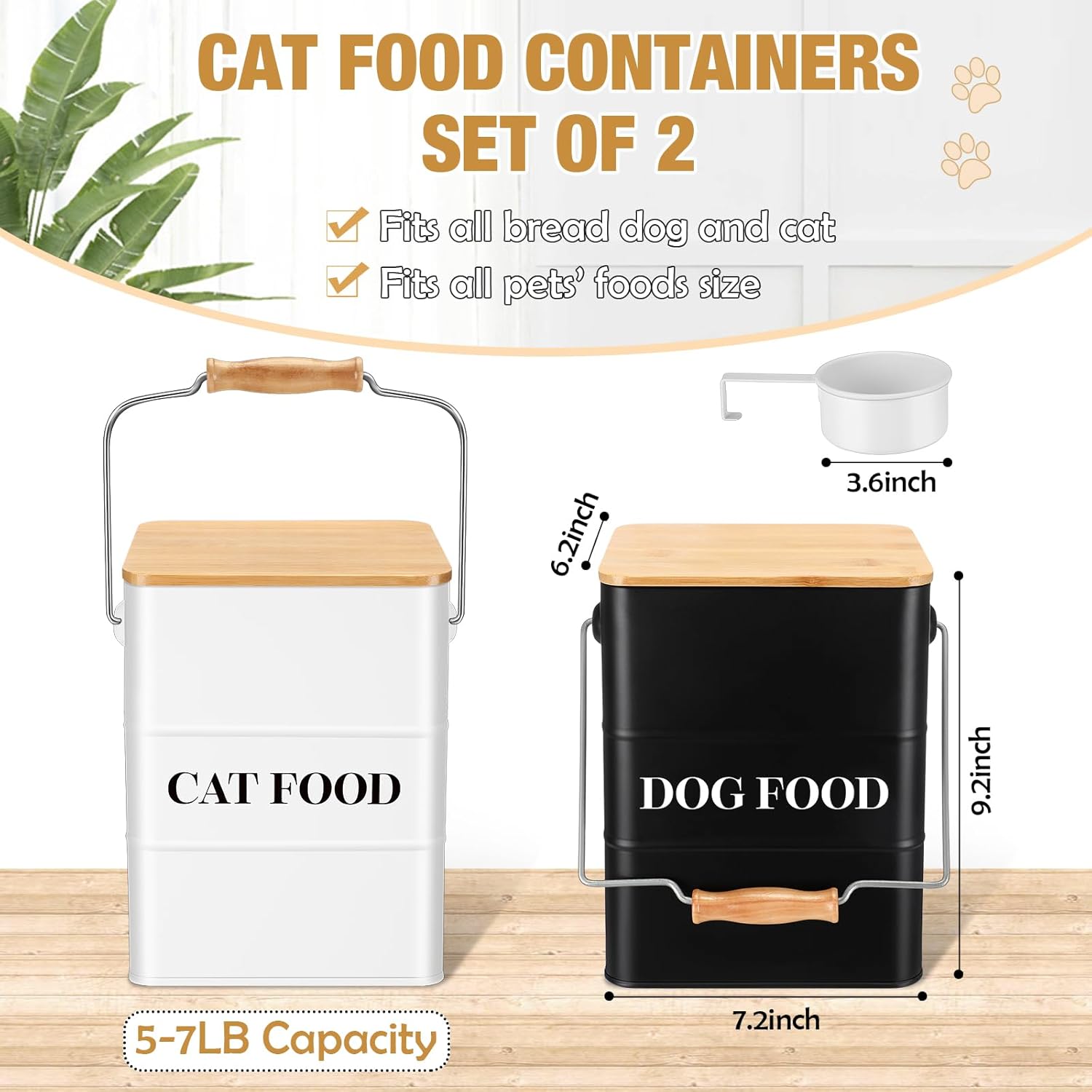Tioncy 2 Pcs Metal Dog and Cat Food Storage Containers Big Pet Food Containers with Bamboo Lids and Spoon Airtight 5-7 Lbs Dog Cat Treat Snack Jars with DIY Labels for Kitchen Counter(White,Black)