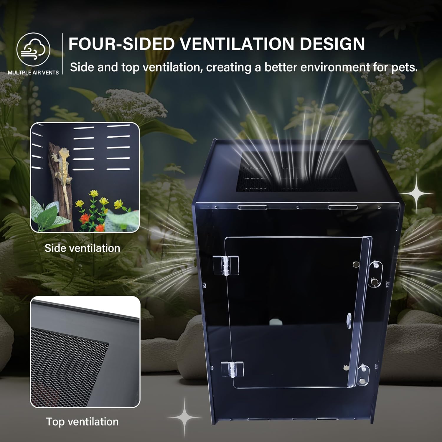 • Five-Sided Light Block Design to Protect Pet Health This terrarium features a unique three-sided light-blocking design that effectively reduces direct sunlight, helping to maintain the optimal temperature and humidity for your reptiles. This ensures that pets like geckos, snakes, and lizards in this reptile tank are protected from harmful UV rays, promoting their health and comfort.