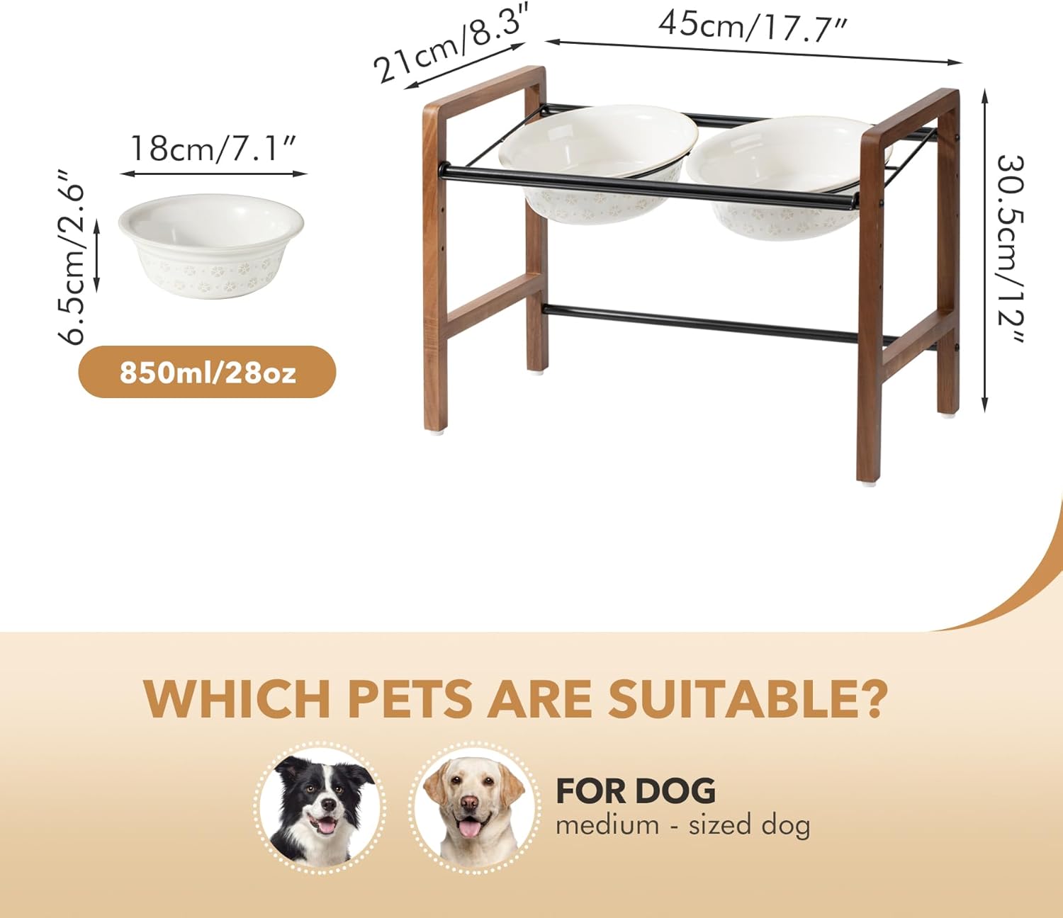 • Acacia Wood and Metal Stand: This stand combines classy acacia wood with metal rods, which is aesthetically pleasing and fits perfectly with any home decor style. Raised ceramic dog bowls provide dogs with correct eating posture, help reduce bloating and neck strain in dogs, and prevent indigestion problems.