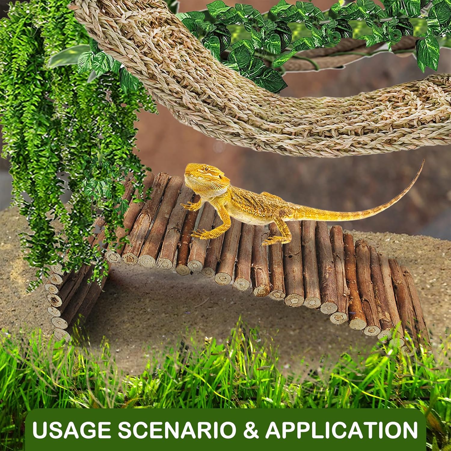• 【Package Included】Reptile tank accessories include 1 Pcs crested gecko wooden bridge(15.7 x 6.0 inches/40 x 15 cm)、1 Pcs reptile rectangular hammock(15.7 x 6.7 inches/40 x 17 cm)、1 Pcs reptile vine plants (33.46 inches/85cm)、1 Pcs fexible leaves decor(78.74in/200cm) 、1 Pcs flexible rattan decoration(78.74in/200cm)、six clasps and five suction cups.