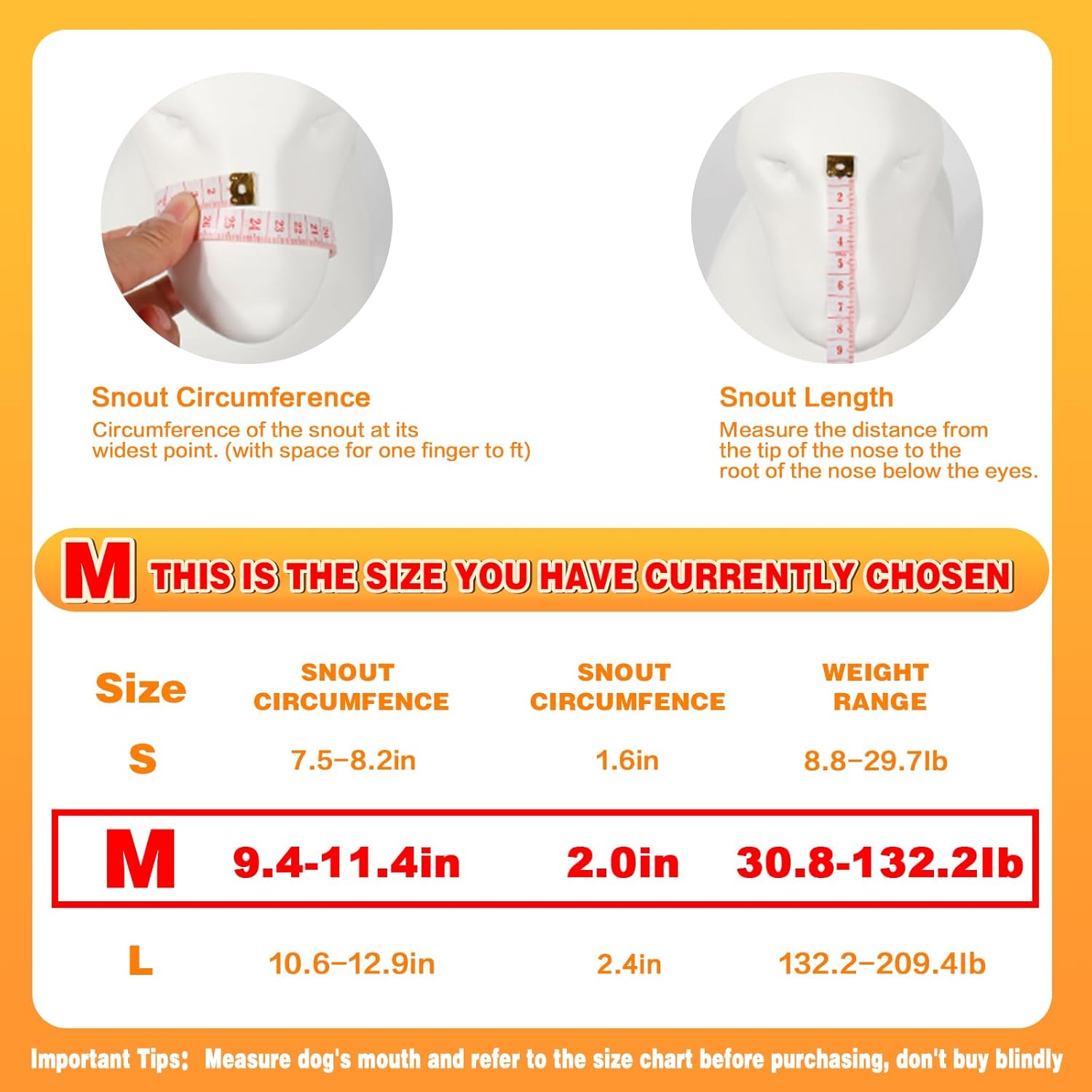 • 【Size Option: M (Circumference: 9.4''-11.4'' in)】Size M is suitable for medium sized dogs, such as Husky and Springer Spaniel, etc. Please make sure to measure the dog's snout before purchase and refer to the size chart to choose the right size. If you have any questions about product quality or size, please feel free to contact us.