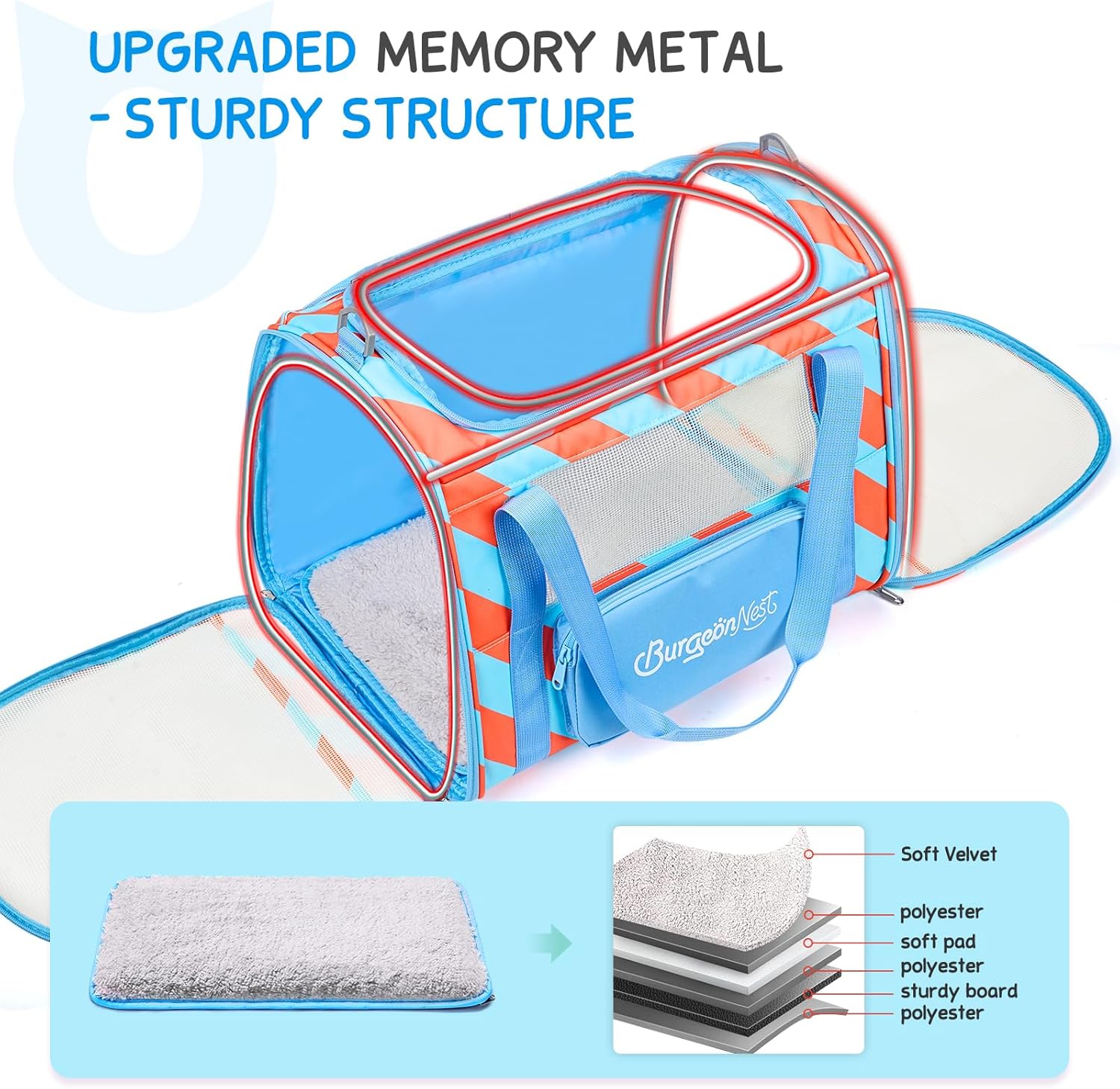 • Stable & Safe Frame: With upgraded memory metal for sturdy frame, this cat carrier for 2 cats does not collapse. Made of breathable fabric, BurgeonNest cat carrier has 3 doors to open, it is more convenient to put your dog cat in or out. Plush cushion with sturdy bottom inserts ensures comfortable environment for pets.