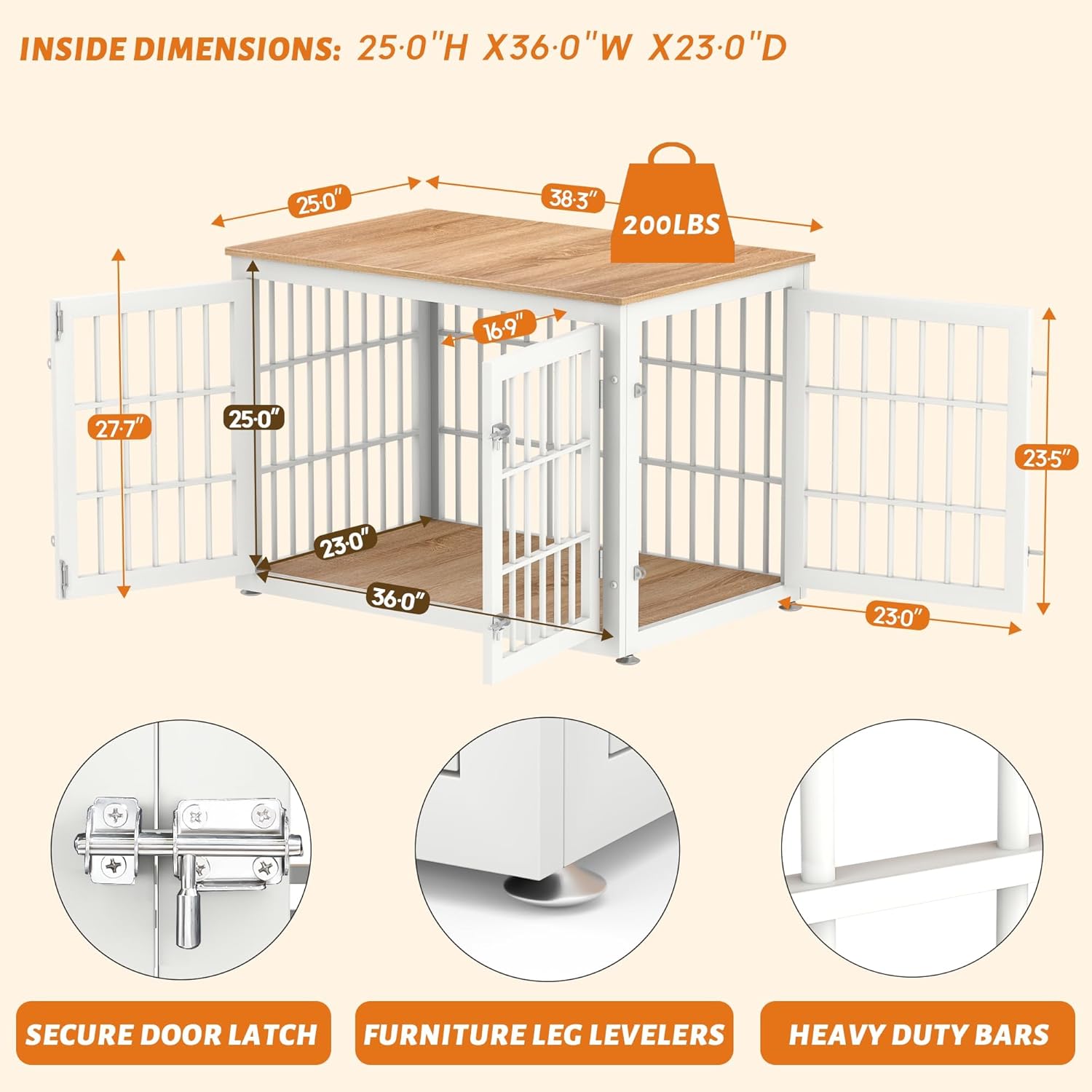 • 【Assemble with Ease】Inside Dimensions: 36.0'L X23.0"W X25.0"H, Overall Dimensions: 38.3"L x 25"W x 27.7"H. Choosing the right crate size is vital to ensure your dog’s safety and comfort.