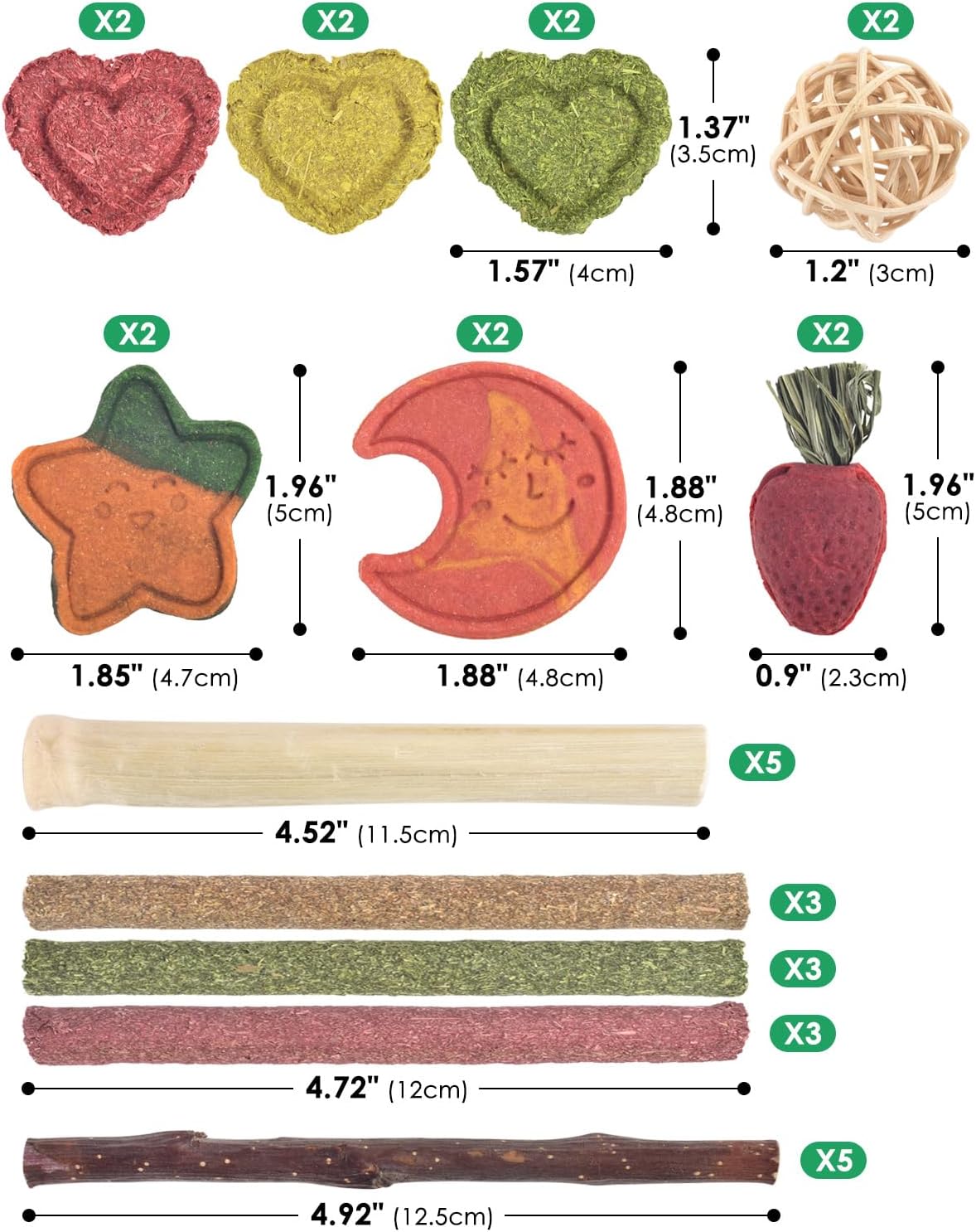 • PIECES GUINEA PIG CHEW TOYS: 5 Timothy/Wheat/Beet+10 Applewood+6 Sweet Bamboo+6 Strawberries * 2+Mushrooms 2+Heart shaped Grass Cake Timothy/Pumpkin/Dragon Fruit 2 each+3 Original Vine Balls/Star 3