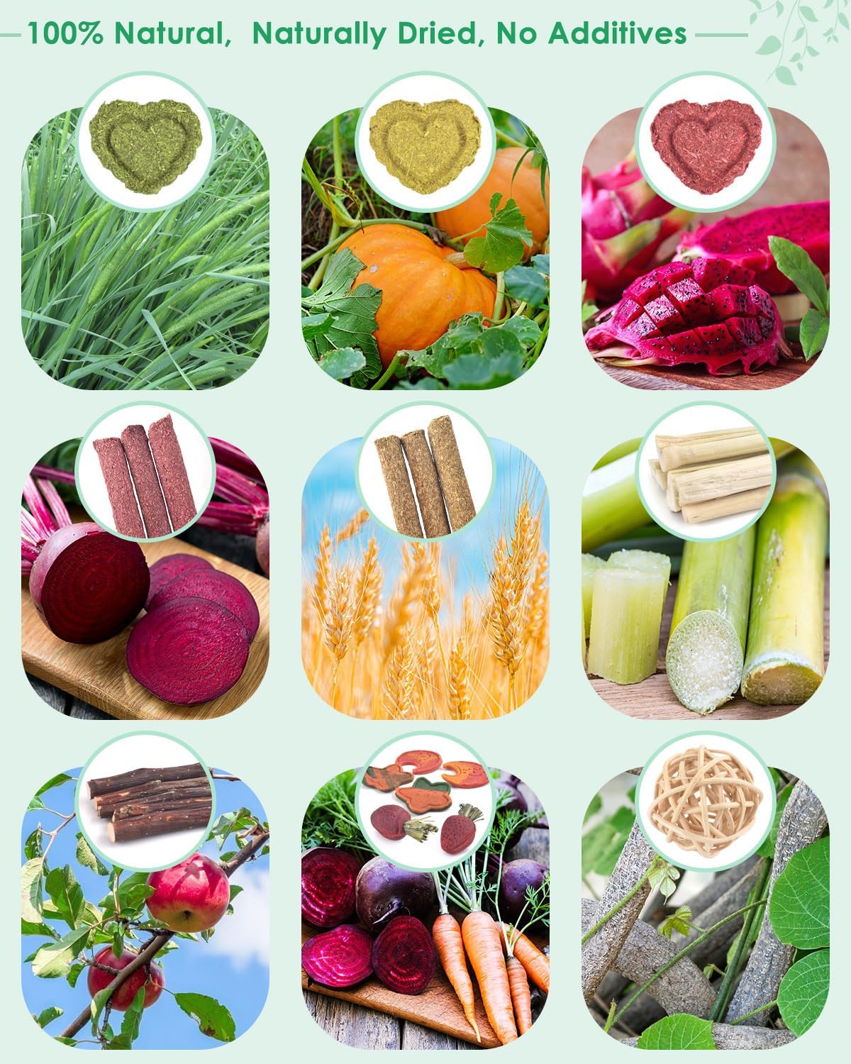 • MADE OF NATURAL MATERIALS: 33 sets of hamster chew toys are made natural apple wood, carrots, wheat, Timothy grass beets, dragon fruit, strawberries, rattan, sweet bamboo, pumpkin, papaya stems, each which is double baked to improve durability and safety, ensuring non-toxic, pigment free, hormone free products a safe chewing experience