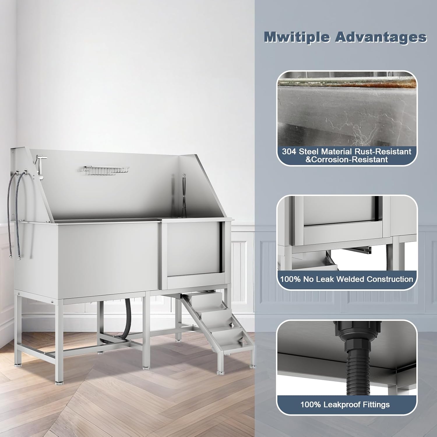 • IDEAL HEIGHT FOR WASHING & GROOMING:Our pet bathtub is designed at an ergonomic height to reduce bending and kneeling, making bathing and grooming easy, helping you say goodbye to the fatigue of the entire body. Stainless steel hot and cold water faucet elevated design suitable for large pet standing height, and 60" shower hose ensure thorough cleaning for different body types.