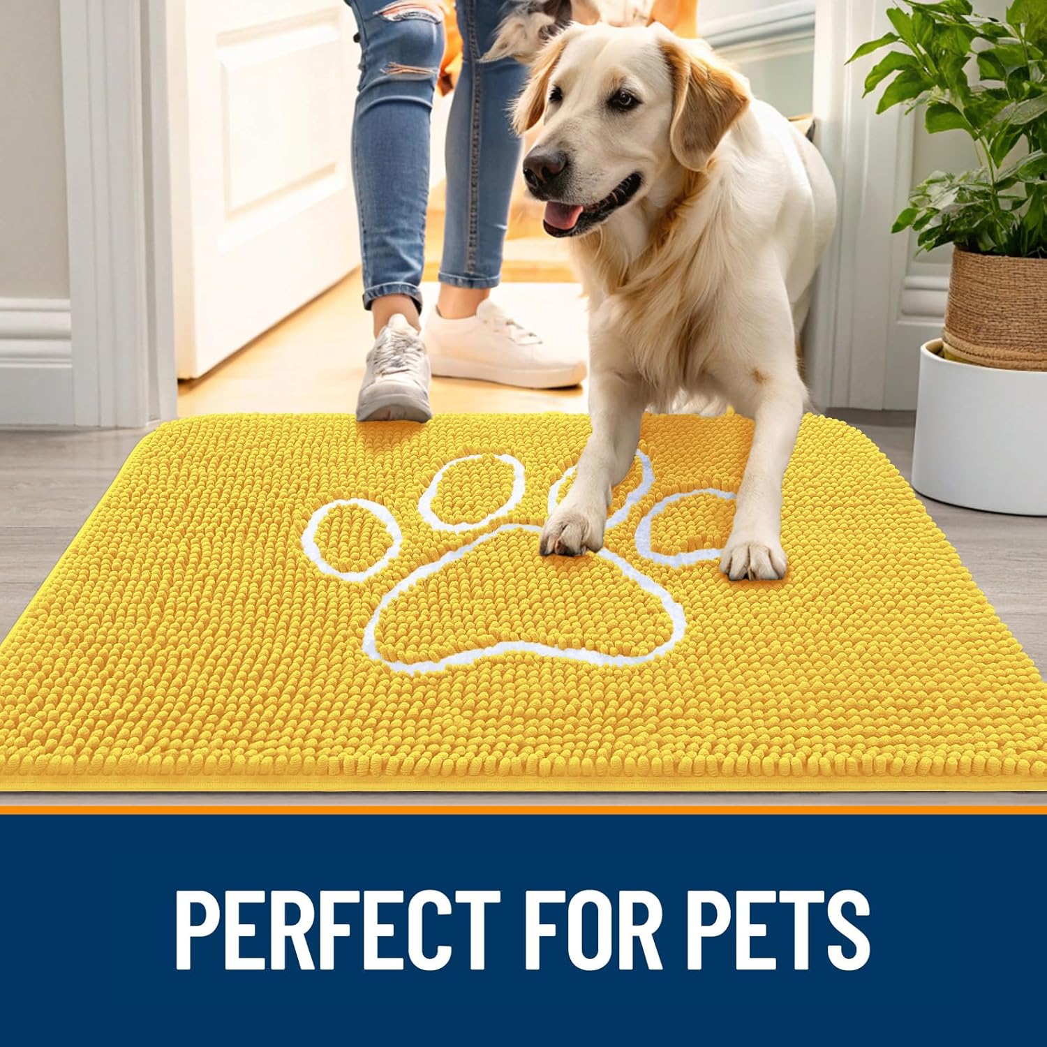 OLANLY Door Mat for Muddy Dog Paws 30x20, Ultra Absorbent Chenille Mud Doormat with Paw Print Design, Non-Slip Washable Doormat for Indoor Entryway, Quick-Dry Pet Bed Mats for Dirty Dogs, Yellow