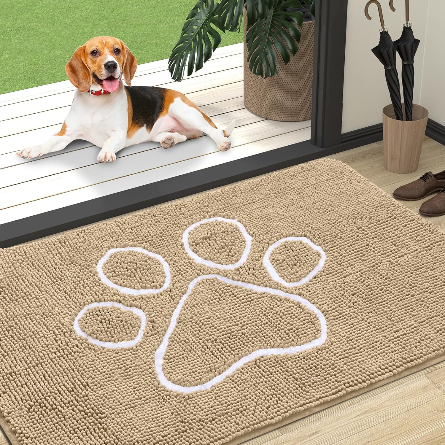 OLANLY Door Mat for Muddy Dog Paws 47x32, Ultra Absorbent Chenille Mud Doormat with Paw Print Design, Non-Slip Washable Doormat for Indoor Entryway, Quick-Dry Pet Bed Mats for Dirty Dogs, Beige