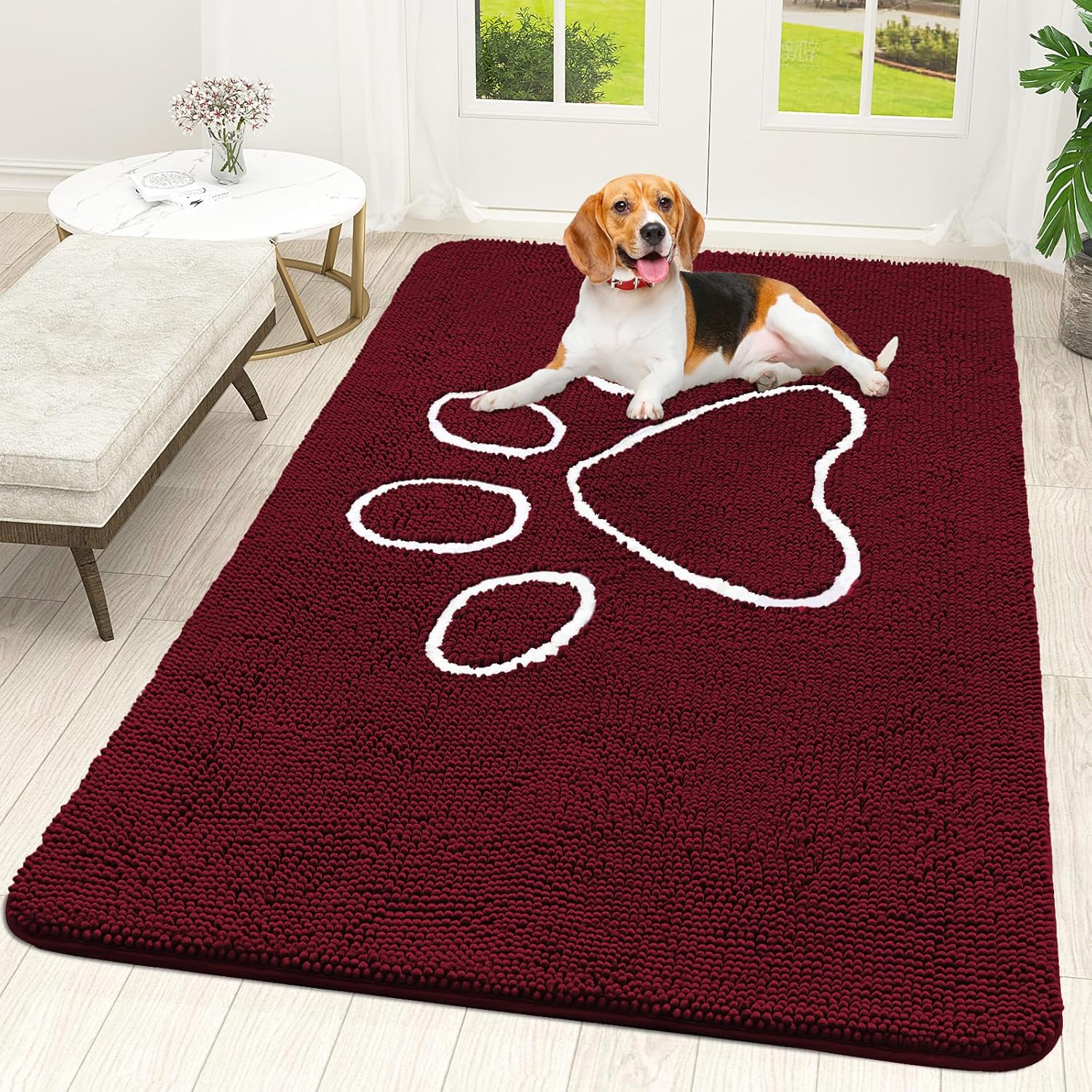 OLANLY Door Mat for Muddy Dog Paws 70x46, Ultra Absorbent Chenille Mud Doormat with Paw Print Design, Non-Slip Washable Doormat for Indoor Entryway, Quick-Dry Pet Bed Mats for Dirty Dogs, Burgundy