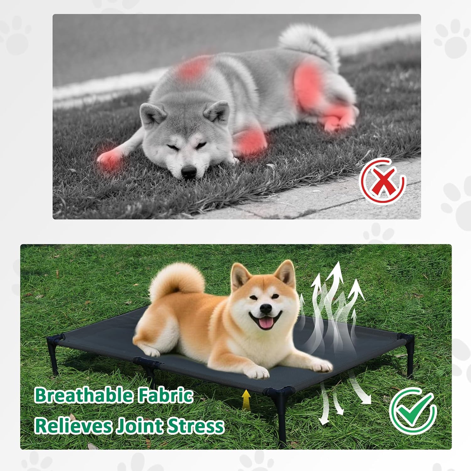 • BREATHABLE TESLIN MESH: This outdoor dog bed comes with breathable and durable Teslin mesh, provides airflow and firm support to relieve joint pressure. Our dog cot bed is suitable for dogs of all life stages, from puppy to the senior