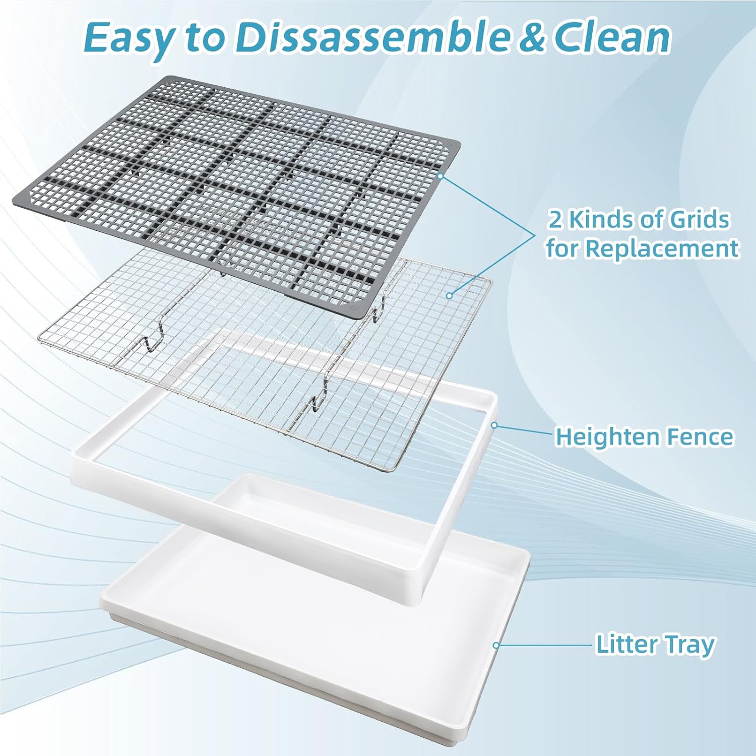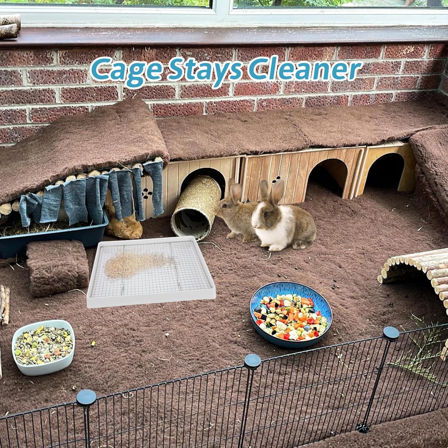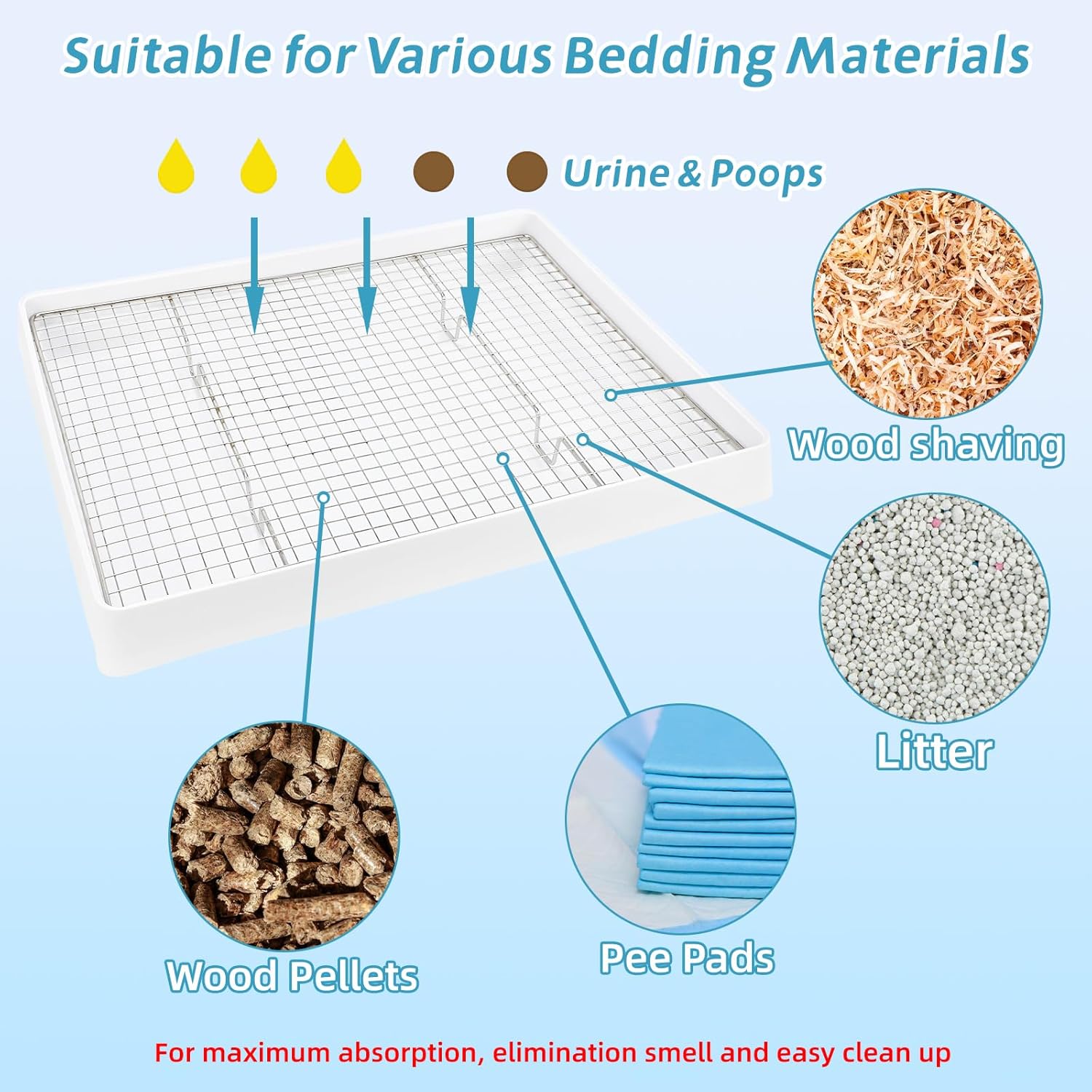 • Ultra Large Rabbit Tray: Our steel grids rabbit litter box is 22"/56cm x 18"/46cm x 3"/7.6cm (L*W*H), and the bottom depth 1.57 inches (Can be storaged 3 days shits of 2 adult rabbits); The extra large size and multi rabbits are able to fit at the same time with plenty of room to spare to set their feeding bowls on top of as well; Tthe rectangular shape fits nicely in the cage corner