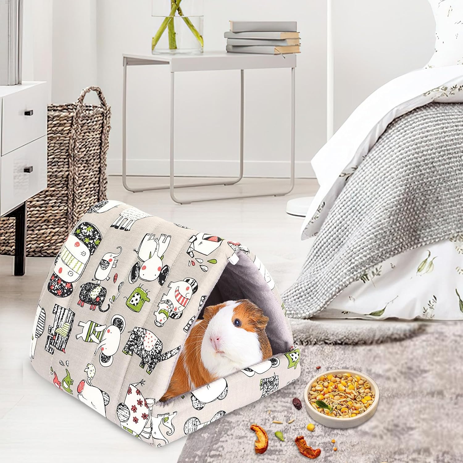• Friendly Design: Adopting grey, the hamster nest is not easy to get dirty,very practical to use, with bright and beautiful patterns. The integrated design avoids accessories from slipping out and can also provide protection for the claws of small animals from being caught. The thickened inner cushion makes the Guinea pig bed stand upright and not easily deformed