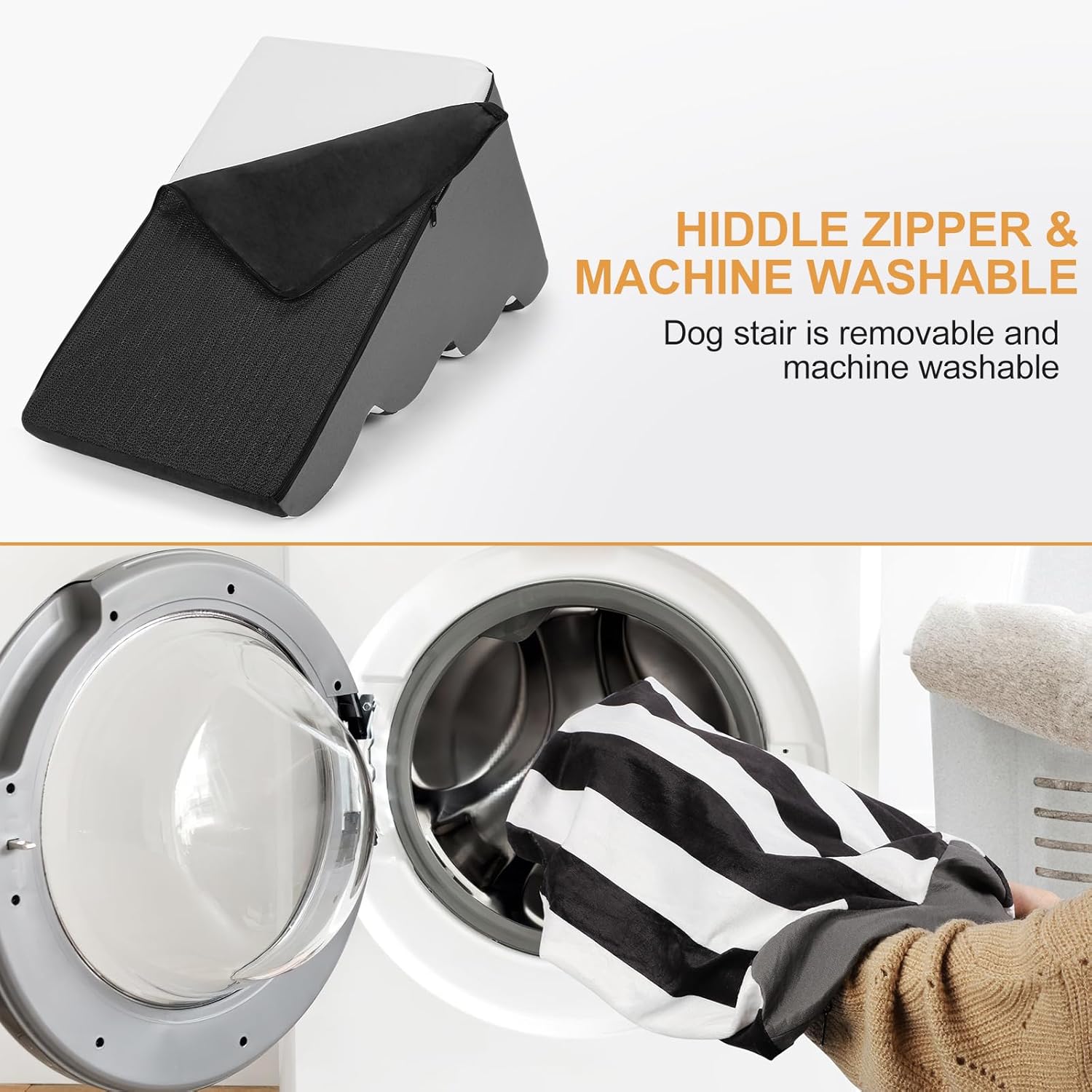 • REMOVABLE AND WASHABLE COVER: The ultra-soft, machine-washable cover on dog stairs for bed simplifies maintenance. Simply unzip and wash the outer layer (avoid washing the foam core). Perfect for dog steps for high bed users, this feature keeps hygiene effortless in busy households