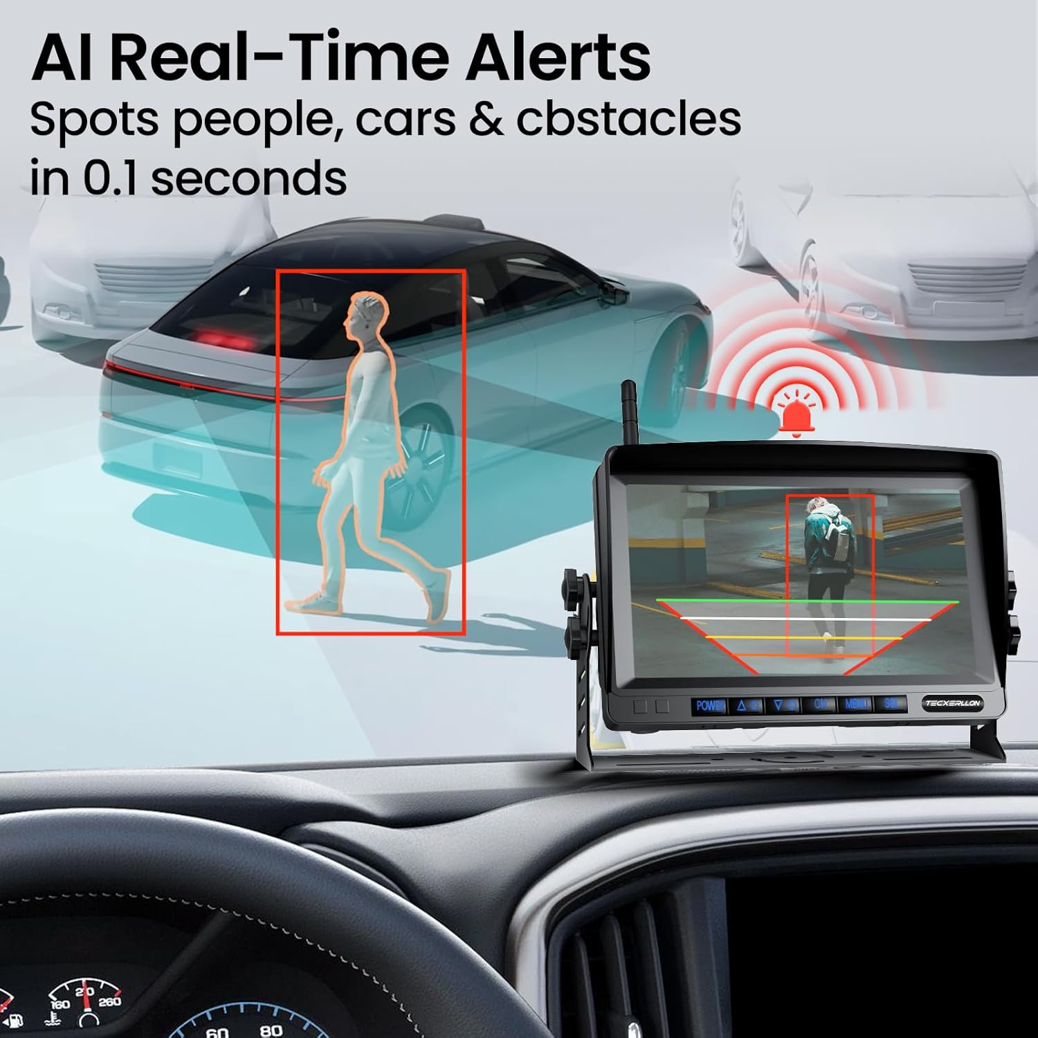 • SMART AND SAFE REVERSING WITH AI: Stay safe with our advanced AI-powered backup camera, which instantly detects pedestrians, vehicles, and obstacles. Receive real-time alerts to stay aware and in control, whether you're reversing or driving. Drive smarter, safer, and with confidenceโ€”every time.